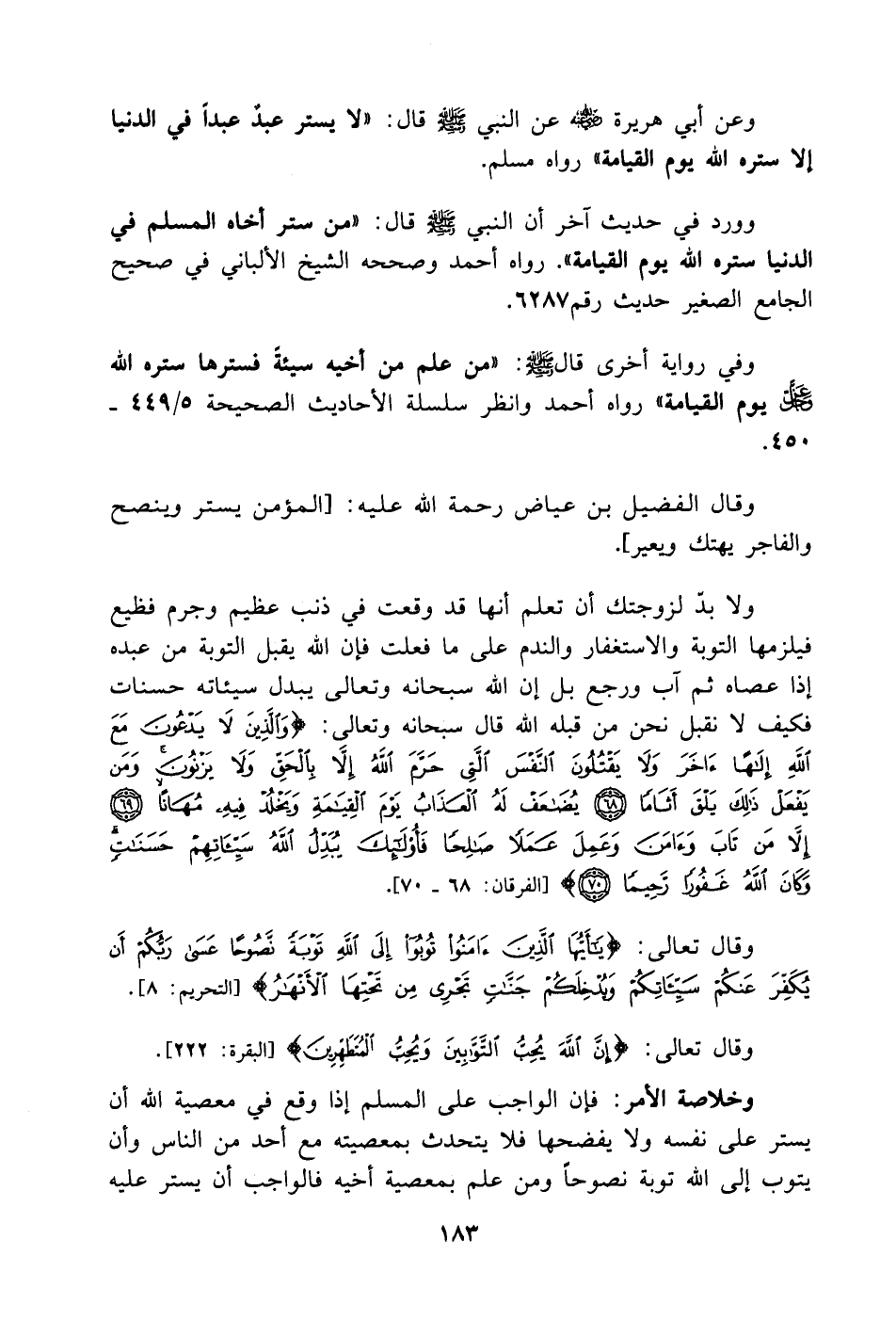 وقال الفضيل بن عياض رحمة الله عليه: [المؤمن يستر وينصح والفاجر يهتك ويعير].