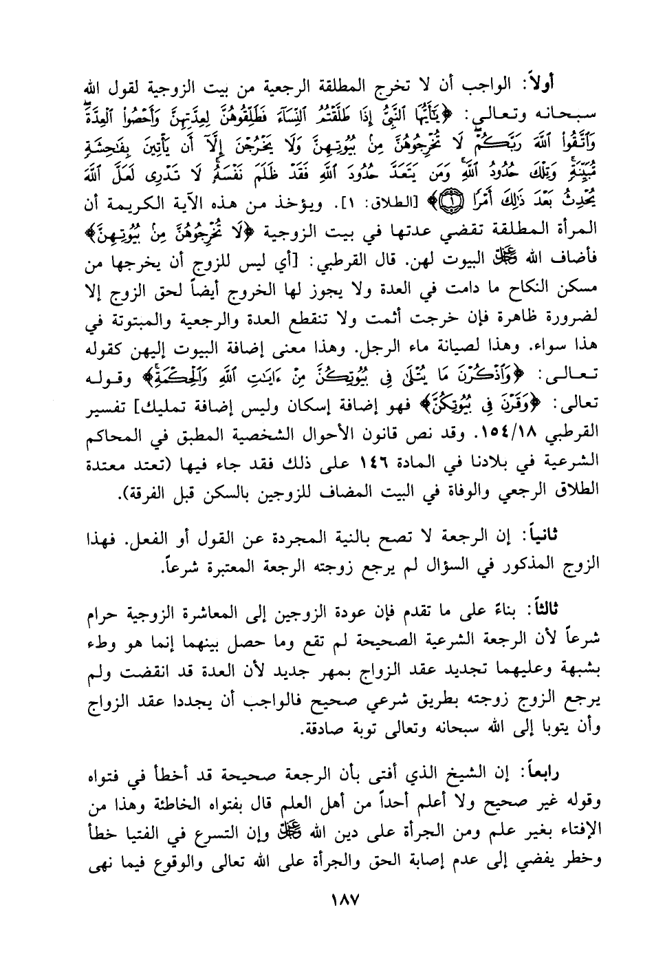 رابعاً: إن الشيخ الذي أفتى بأن الرجعة صحيحة قد أخطأ في فتواه وقوله غير صحيح ولا أعلم أحداً من أهل العلم قال بفتواه الخاطئة وهذا من الإفتاء بغير علم ومن الجرأة على دين الله عز وجل وإن التسرع في الفتيا خطأ وخطر يفضي إلى عدم إصابة الحق والجرأة على الله تعالى والوقوع فيما نهى