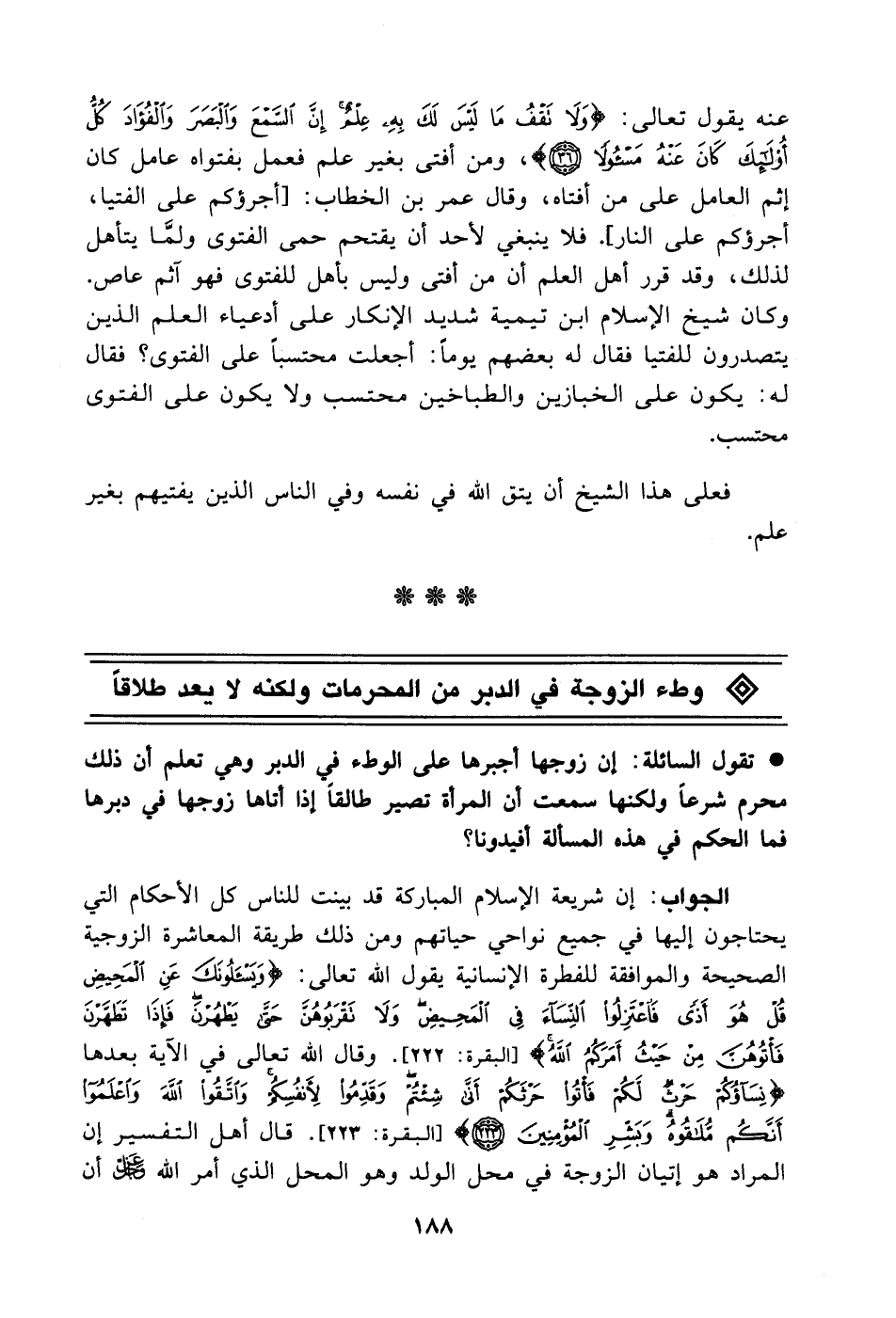 عنه يقول تعالى: {وَلَا تَقْفُ مَا لَيْسَ لَكَ بِهِ عِلْمٌ إِنَّ السَّمْعَ وَالْبَصَرَ وَالْفُؤَادَ كُلُّ أُولَئِكَ كَانَ عَنْهُ مَسْئُولًا}، ومن أفتى بغير علم فعمل بفتواه عامل كان إثم العامل على من أفتاه، وقال عمر بن الخطاب: [أجرؤكم على الفتيا، أجرؤكم على النار]. فلا ينبغي لأحد أن يقتحم حمى الفتوى ولمَّا يتأهل لذلك، وقد قرر أهل العلم أن من أفتى وليس بأهل للفتوى فهو آثم عاص. وكان شيخ الإسلام ابن تيمية شديد الإنكار على أدعياء العلم الذين يتصدرون للفتيا فقال له بعضهم يوماً: أجعلت محتسباً على الفتوى؟ فقال له: يكون على الخبازين والطباخين محتسب ولا يكون على الفتوى محتسب.