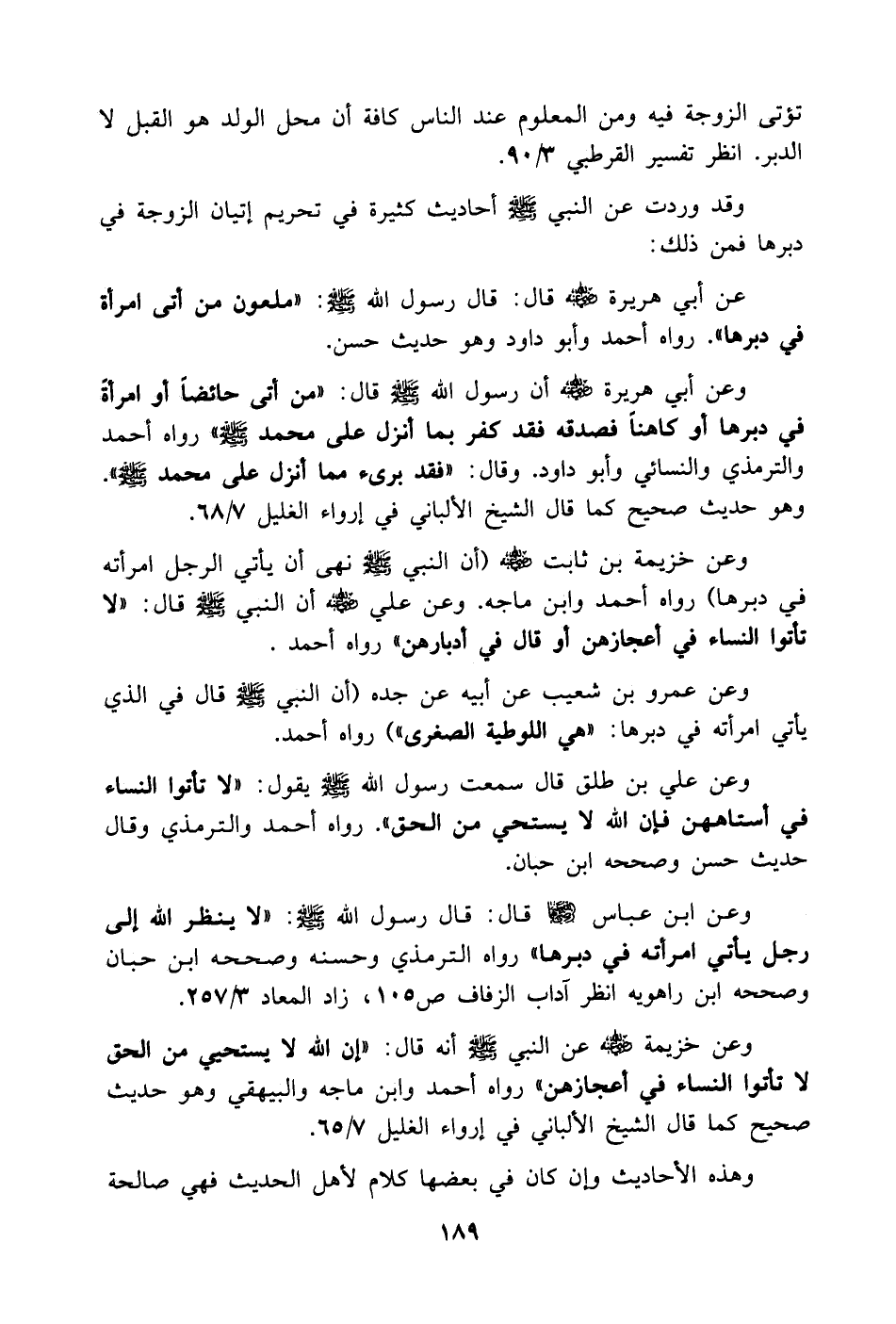 وعن خزيمة بن ثابت - رضي الله عنه - (أن النبي - صَلَّى اللهُ عَلَيْهِ وَسَلَّمَ - نهى أن يأتي الرجل امرأته في دبرها) رواه أحمد وابن ماجة. وعن علي - رضي الله عنه - أن النبي - صَلَّى اللهُ عَلَيْهِ وَسَلَّمَ - قال: (لا تأتوا النساء في أعجازهن أو قال في أدبارهن) رواه أحمد.