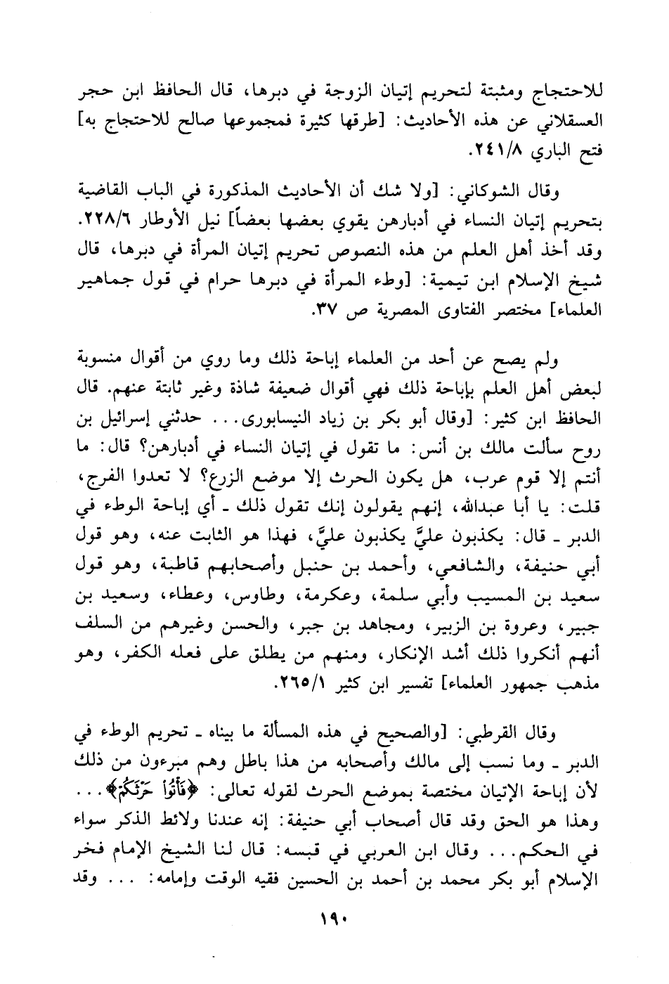 وقال الشوكاني: [ولا شك أن الأحاديث المذكورة في الباب القاضية بتحريم إتيان النساء في أدبارهن يقوي بعضها بعضاً] نيل الأوطار6/ 228. وقد أخذ أهل العلم من هذه النصوص تحريم إتيان المرأة في دبرها قال شيخ الإسلام ابن تيمية: [وطء المرأة في دبرها حرام في قول جماهير العلماء] مختصر الفتاوى المصرية ص 37.