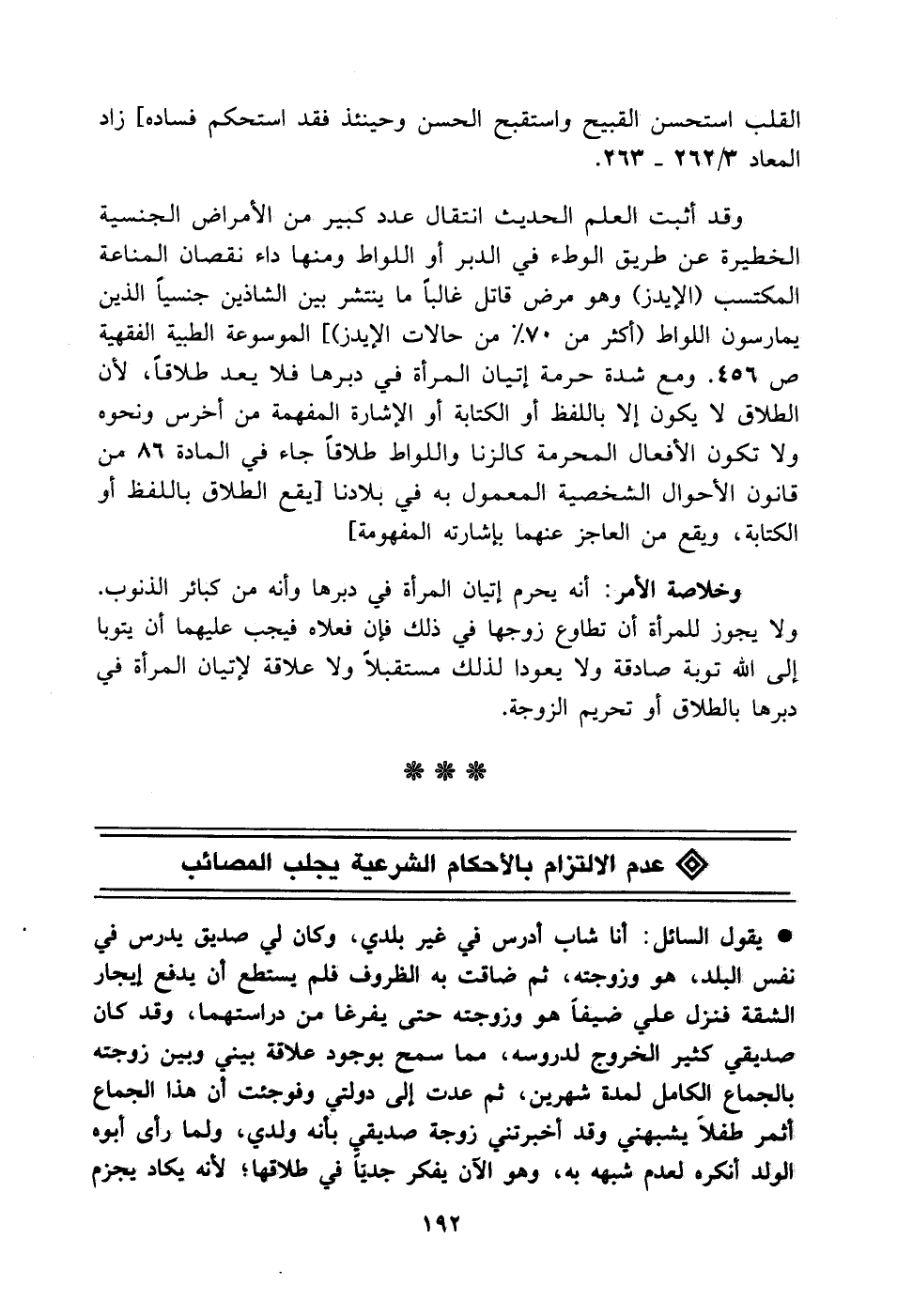 وقد أثبت العلم الحديث انتقال عدد كبير من الأمراض الجنسية الخطيرة عن طريق الوطء في الدبر أو اللواط ومنها داء نقصان المناعة المكتسب (الإيدز) وهو مرض قاتل غالباً ما ينتشر بين الشاذين جنسياً الذين يمارسون اللواط (أكثر من 70% من حالات الإيدز)] الموسوعة الطبية الفقهية ص456. ومع شدة حرمة إتيان المرأة في دبرها فلا يعد طلاقاً، لأن الطلاق لا يكون إلا باللفظ أو الكتابة أو الإشارة المفهمة من أخرس ونحوه ولا تكون الأفعال المحرمة كالزنا واللواط طلاقاً جاء في المادة 86 من قانون الأحوال الشخصية المعمول به في بلادنا [يقع الطلاق باللفظ أو الكتابة، ويقع من العاجز عنهما بإشارته المفهومة]