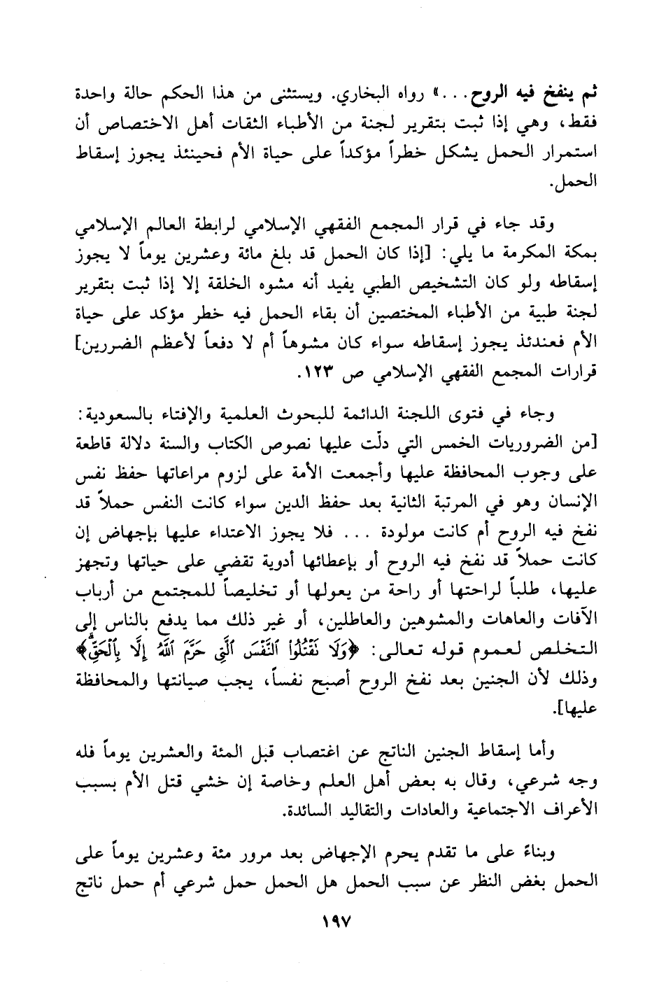 وجاء في فتوى اللجنة الدائمة للبحوث العلمية والإفتاء بالسعودية: [من الضروريات الخمس التي دلّت عليها نصوص الكتاب والسنة دلالة قاطعة على وجوب المحافظة عليها وأجمعت الأمة على لزوم مراعاتها حفظ نفس الإنسان وهو في المرتبة الثانية بعد حفظ الدين سواء كانت النفس حملاً قد نفخ فيه الروح أم كانت مولودة ... فلا يجوز الاعتداء عليها بإجهاض إن كانت حملاً قد نفخ فيه الروح أو بإعطائها أدوية تقضي على حياتها وتجهز عليها، طلباً لراحتها أو راحة من يعولها أو تخليصاً للمجتمع من أرباب الآفات والعاهات والمشوهين والعاطلين، أو غير ذلك مما يدفع بالناس إلى التخلص لعموم قوله تعالى: {وَلاَ تَقْتُلُواْ النَّفْسَ الَّتِي حَرَّمَ اللهُ إِلاَّ بِالحَقّ} وذلك لأن الجنين بعد نفخ الروح أصبح نفساً، يجب صيانتها والمحافظة عليها].