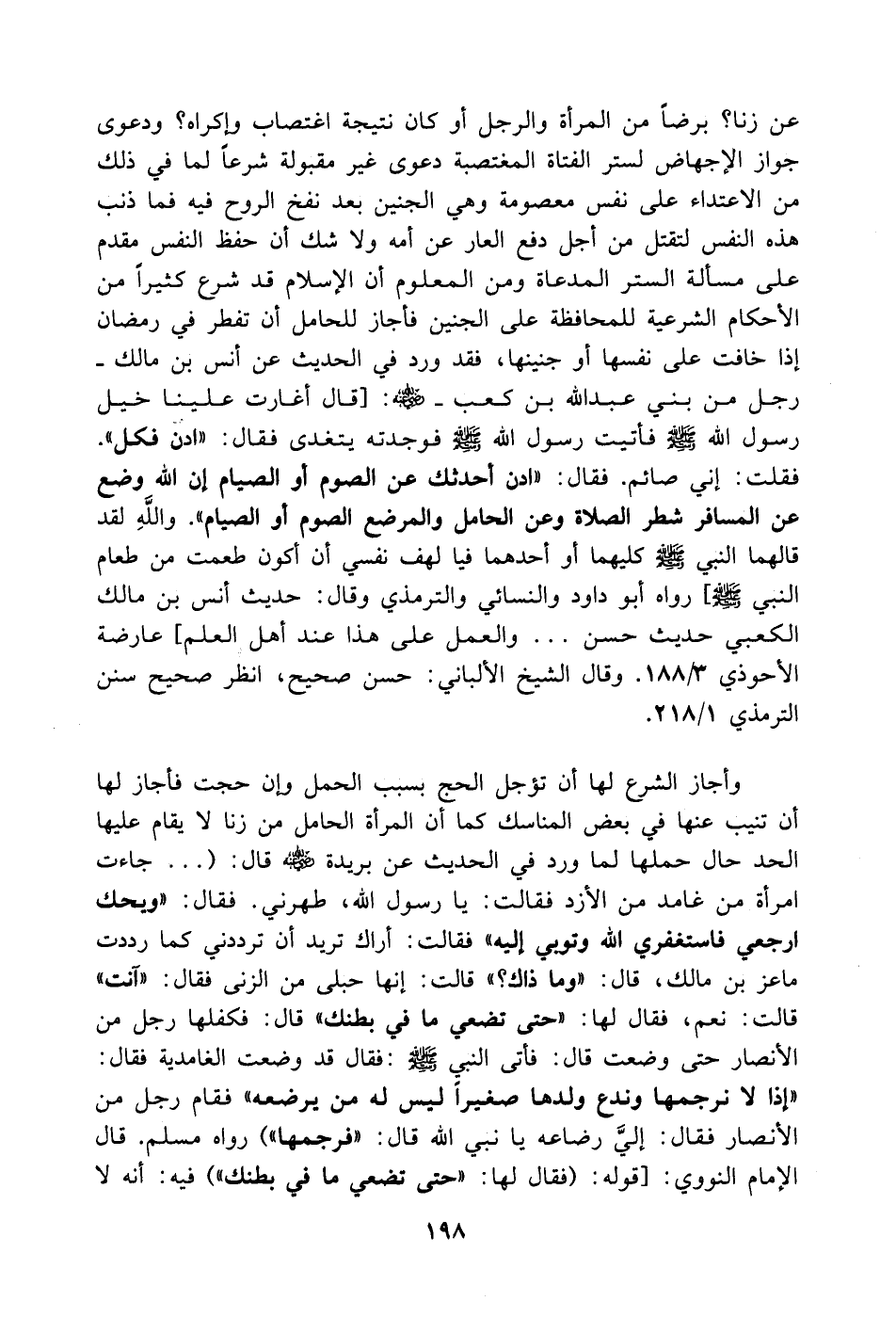 عن زنا؟ برضاً من المرأة والرجل أو كان نتيجة اغتصاب وإكراه؟ ودعوى جواز الإجهاض لستر الفتاة المغتصبة دعوى غير مقبولة شرعاً لما في ذلك من الاعتداء على نفس معصومة وهي الجنين بعد نفخ الروح فيه فما ذنب هذه النفس لتقتل من أجل دفع العار عن أمه ولا شك أن حفظ النفس مقدم على مسألة الستر المدعاة ومن المعلوم أن الإسلام قد شرع كثيراً من الأحكام الشرعية للمحافظة على الجنين فأجاز للحامل أن تفطر في رمضان إذا خافت على نفسها أو جنينها، فقد ورد في الحديث عن أنس بن مالك - رجل من بني عبد الله بن كعب - رضي الله عنه -: [قال أغارت علينا خيل رسول الله - صَلَّى اللهُ عَلَيْهِ وَسَلَّمَ - فأتيت رسول الله - صَلَّى اللهُ عَلَيْهِ وَسَلَّمَ - فوجدته يتغدى فقال: ادن فكل. فقلت: إني صائم. فقال: ادن أحدثك عن الصوم أو الصيام إن الله وضع عن المسافر شطر الصلاة وعن الحامل والمرضع الصوم أو الصيام. واللهِ لقد قالهما النبي - صَلَّى اللهُ عَلَيْهِ وَسَلَّمَ - كليهما أو أحدهما فيا لهف نفسي أن أكون طعمت من طعام النبي - صَلَّى اللهُ عَلَيْهِ وَسَلَّمَ -] رواه أبو داود والنسائي والترمذي وقال: حديث أنس بن مالك الكعبي حديث حسن ... والعمل على هذا عند أهل العلم] عارضة الأحوذي 3/ 188. وقال الشيخ الألباني: حسن صحيح، انظر صحيح سنن الترمذي 1/ 218.
