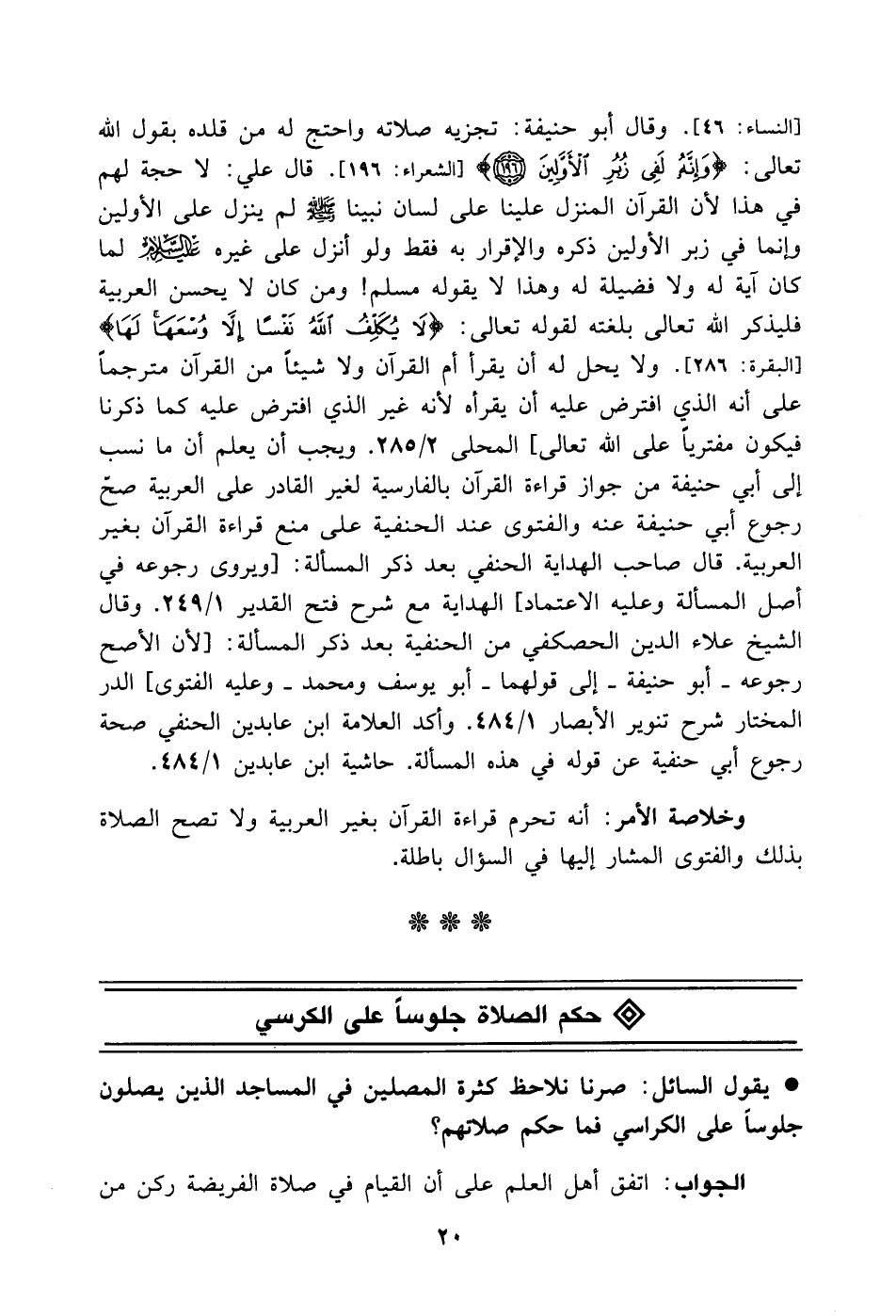 سورة النساء الآية 46. وقال أبو حنيفة: تجزيه صلاته واحتج له من قلده بقول الله تعالى: {وَإِنَّهُ لَفِي زُبُرِ الْأَوَّلِينَ} سورة الشعراء الآية 196. قال علي: لا حجة لهم في هذا لأن القرآن المنزل علينا على لسان نبينا - صَلَّى اللهُ عَلَيْهِ وَسَلَّمَ - لم ينزل على الأولين وإنما في زبر الأولين ذكره والإقرار به فقط ولو أنزل على غيره عليه السلام لما كان آية له ولا فضيلة له وهذا لا يقوله مسلم! ومن كان لا يحسن العربية فليذكر الله تعالى بلغته لقوله تعالى: {لَا يُكَلِّفُ اللَّهُ نَفْسًا إِلَّا وُسْعَهَا لَهَا} سورة البقرة الآية 286. ولا يحل له أن يقرأ أم القرآن ولا شيئاً من القرآن مترجماً على أنه الذي افترض عليه أن يقرأه لأنه غير الذي افترض عليه كما ذكرنا فيكون مفترياً على الله تعالى] المحلى 2/ 285. ويجب أن يعلم أن ما نسب إلى أبي حنيفة من جواز قراءة القرآن بالفارسية لغير القادر على العربية صحّ رجوع أبي حنيفة عنه والفتوى عند الحنفية على منع قراءة القرآن بغير العربية. قال صاحب الهداية الحنفي بعد ذكر