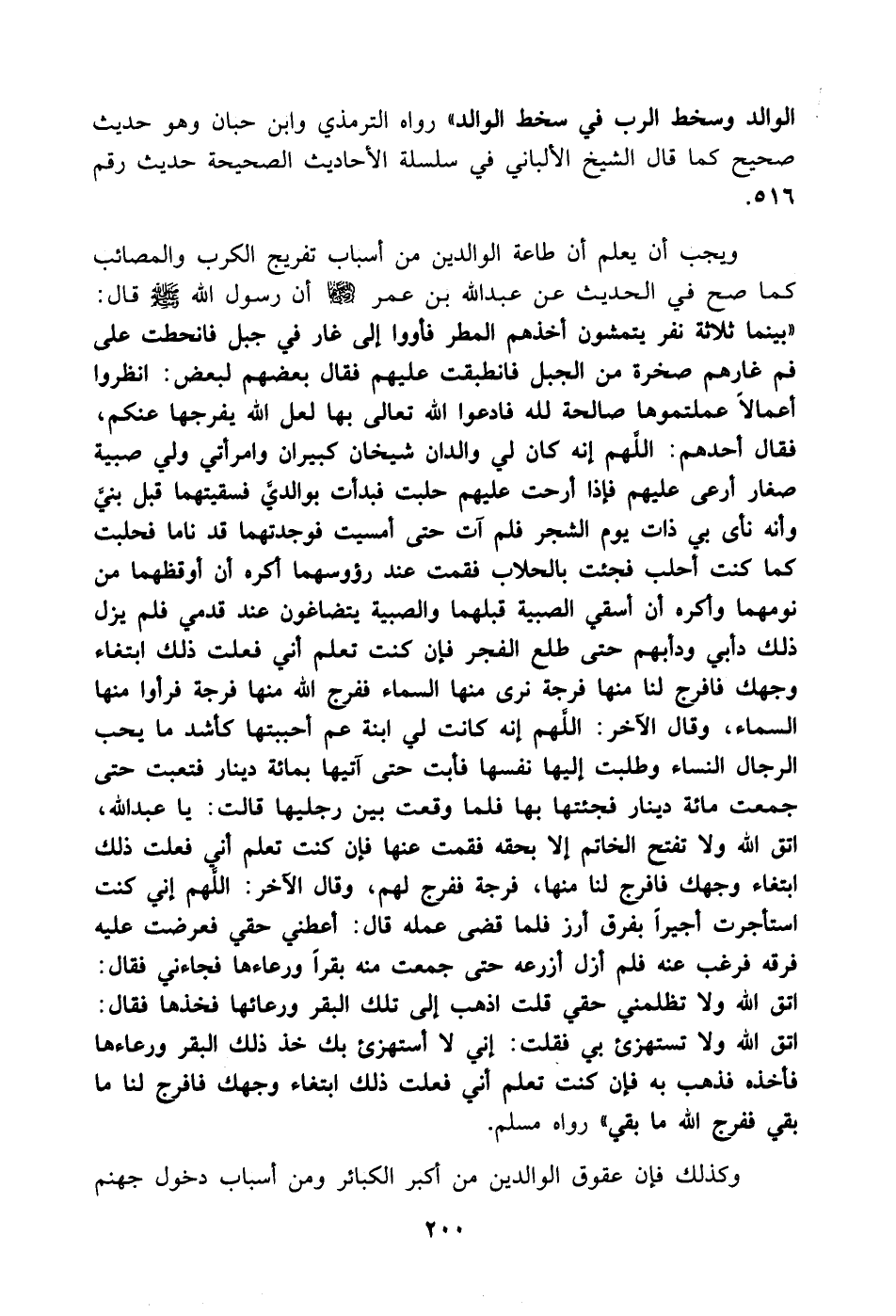 ويجب أن يعلم أن طاعة الوالدين من أسباب تفريج الكرب والمصائب كما صح في الحديث عن عبد الله بن عمر رضي الله عنهما أن رسول الله - صَلَّى اللهُ عَلَيْهِ وَسَلَّمَ - قال: (بينما ثلاثة نفر يتمشون أخذهم المطر فأووا إلى غار في جبل فانحطت على فم غارهم صخرة من الجبل فانطبقت عليهم فقال بعضهم لبعض انظروا أعمالاً عملتموها صالحة لله فادعوا الله تعالى بها لعل الله يفرجها عنكم فقال أحدهم اللهم إنه كان لي والدان شيخان كبيران وامرأتي ولي صبية صغار أرعى عليهم فإذا أرحت عليهم حلبت فبدأت بوالديَّ فسقيتهما قبل بنيَّ وأنه نأى بي ذات يوم الشجر فلم آت حتى أمسيت فوجدتهما قد ناما فحلبت كما كنت أحلب فجئت بالحلاب فقمت عند رؤوسهما أكره أن أوقظهما من نومهما وأكره أن أسقي الصبية قبلهما والصبية يتضاغون عند قدمي فلم يزل ذلك دأبي ودأبهم حتى طلع الفجر فإن كنت تعلم أني فعلت ذلك ابتغاء وجهك فافرج لنا منها فرجة نرى منها السماء ففرج الله منها فرجة فرأوا منها السماء وقال الآخر اللهم إنه كانت لي ابنة عم أحببتها كأشد ما يحب الرجال النساء وطلبت إليها نفسها فأبت حتى آتيها بمائة دينار فتعبت حتى جمعت مائة دينار فجئتها بها فلما وقعت بين رجليها قالت يا عبد الله اتق الله ولا تفتح الخاتم إلا بحقه فقمت عنها فإن كنت تعلم أني فعلت ذلك ابتغاء وجهك فافرج لنا منها فرجة ففرج لهم وقال الآخر اللهم إني كنت استأجرت أجيراً بفرق أرز فلما قضى عمله قال أعطني حقي فعرضت عليه فرقه فرغب عنه فلم أزل أزرعه حتى جمعت منه بقراً ورعاءها فجاءني فقال اتق الله ولا تظلمني حقي قلت اذهب إلى تلك البقر ورعائها فخذها فقال اتق الله ولا تستهزئ بي فقلت إني لا أستهزئ بك خذ ذلك البقر ورعاءها فأخذه فذهب به فإن كنت تعلم أني فعلت ذلك ابتغاء وجهك فافرج لنا ما بقي ففرج الله ما بقي) رواه مسلم.