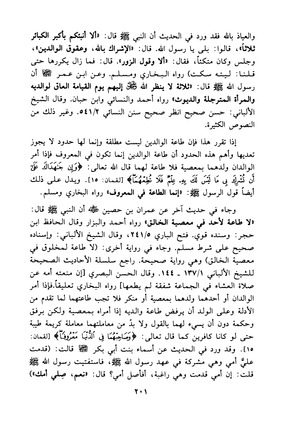 وجاء في حديث آخر عن عمران بن حصين - رضي الله عنه - أن النبي - صَلَّى اللهُ عَلَيْهِ وَسَلَّمَ - قال: (لا طاعة لأحد في معصية الخالق) رواه أحمد والبزار وقال الحافظ ابن حجر: وسنده قوي. فتح الباري 5/ 241، وقال الشيخ الألباني: وإسناده صحيح على شرط مسلم. وجاء في رواية أخرى: (لا طاعة لمخلوق في معصية الخالق) وهي رواية صحيحة. راجع سلسلة الأحاديث الصحيحة للشيخ الألباني 1/ 137 - 144. وقال الحسن البصري [إن منعته أمه عن صلاة العشاء في الجماعة شفقة لم يطعها] رواه البخاري تعليقاً. فإذا أمر الوالدان أو أحدهما ولدهما بمعصية أو منكر فلا تجب طاعتهما لما تقدم من الأدلة وعلى الولد أن يرفض طاعة والديه إذا أمراه بمعصية ولكن برفق وحكمة دون أن يسيء لهما بالقول ولا بد من معاملتهما معاملة كريمة طيبة حتى لو كانا كافرين كما قال تعالى: {وَصَاحِبْهُمَا فِي الدُّنْيَا مَعْرُوفًا} سورة لقمان الآية 15. وقد ورد في الحديث عن أسماء بنت أبي بكر رضي الله عنهما قالت: (قدمت عليَّ أمي وهي مشركة في عهد رسول الله - صَلَّى اللهُ عَلَيْهِ وَسَلَّمَ -، فاستفتيت رسول الله - صَلَّى اللهُ عَلَيْهِ وَسَلَّمَ - قلت: إن أمي قدمت وهي راغبة، أفأصل أمي؟ قال: نعم، صِلي أمك)