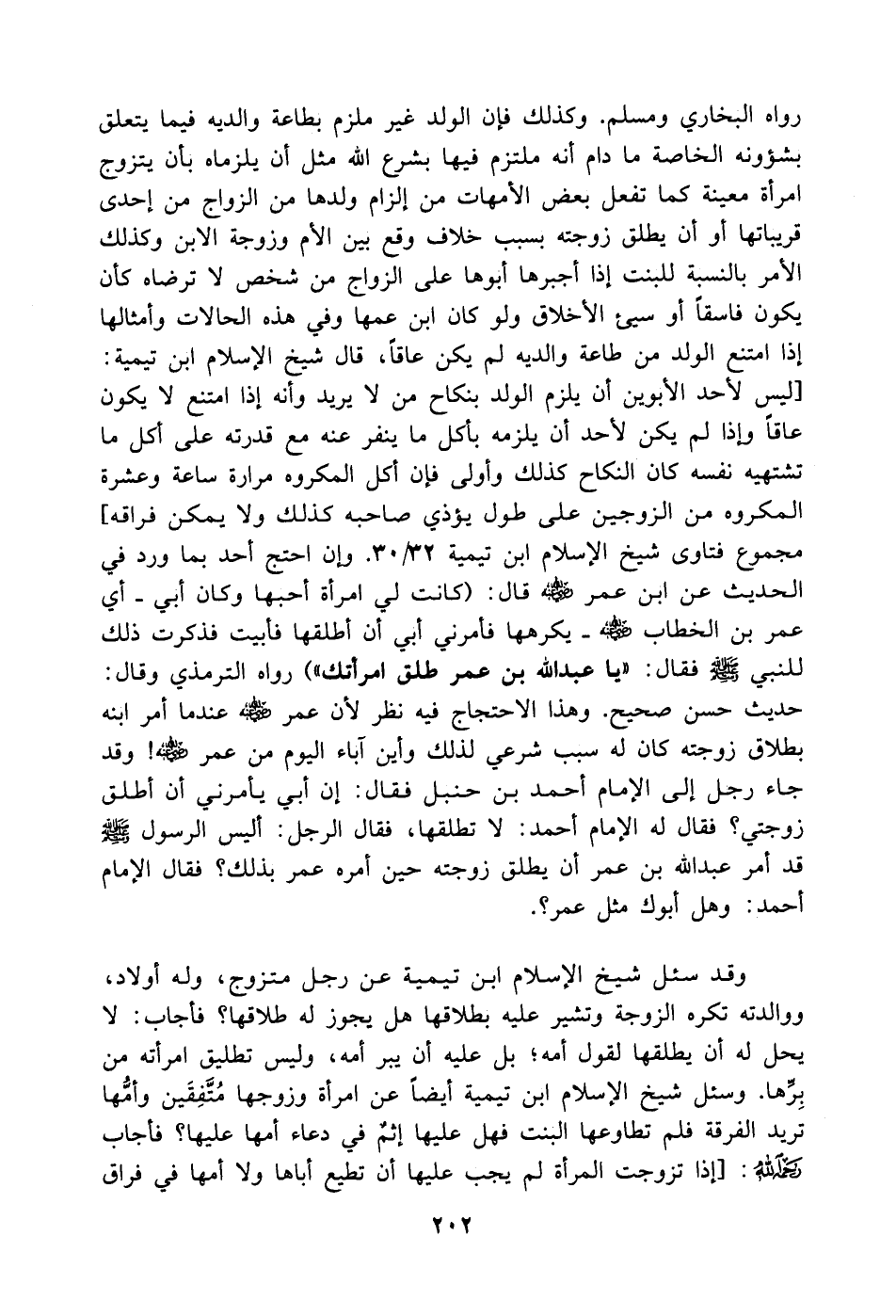 مع قدرته على أكل ما تشتهيه نفسه كان النكاح كذلك وأولى فإن أكل المكروه مرارة ساعة وعشرة المكروه من الزوجين على طول يؤذي صاحبه كذلك ولا يمكن فراقه] مجموع فتاوى شيخ الإسلام ابن تيمية 32/ 30. وإن احتج أحد بما ورد في الحديث عن ابن عمر - رضي الله عنه - قال (كانت لي امرأة أحبها وكان أبي - أي عمر بن الخطاب - رضي الله عنه - يكرهها فأمرني أبي أن أطلقها فأبيت فذكرت ذلك للنبي - صَلَّى اللهُ عَلَيْهِ وَسَلَّمَ - فقال يا عبد الله بن عمر طلق امرأتك) رواه الترمذي وقال: حديث حسن صحيح. وهذا الاحتجاج فيه نظر لأن عمر - رضي الله عنه - عندما أمر ابنه بطلاق زوجته كان له سبب شرعي لذلك وأين آباء اليوم من عمر - رضي الله عنه -!!! وقد جاء رجل إلى الإمام أحمد بن حنبل فقال: إن أبي يأمرني أن أطلق زوجتي؟ فقال له الإمام أحمد: لا تطلقها، فقال الرجل: أليس الرسول - صَلَّى اللهُ عَلَيْهِ وَسَلَّمَ - قد أمر عبد الله بن عمر أن يطلق زوجته حين أمره عمر بذلك؟ فقال الإمام أحمد: وهل أبوك مثل عمر؟.