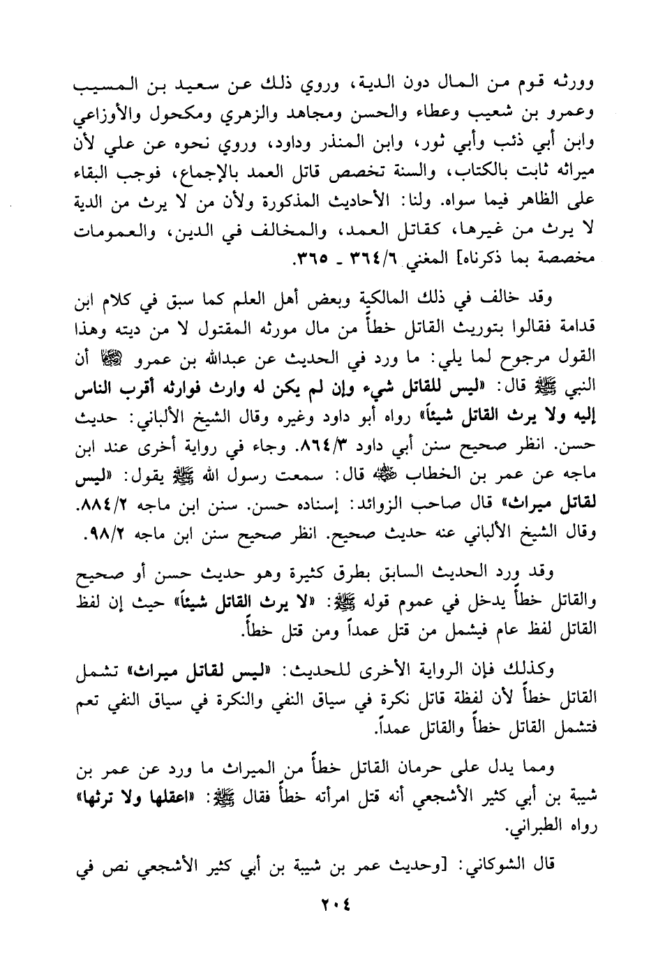 وقد خالف في ذلك المالكية وبعض أهل العلم كما سبق في كلام ابن قدامة فقالوا بتوريث القاتل خطأً من مال مورثه المقتول لا من ديته وهذا القول مرجوح لما يلي: ما ورد في الحديث عن عبد الله بن عمرو رضي الله عنهما أن النبي - صَلَّى اللهُ عَلَيْهِ وَسَلَّمَ - قال: (ليس للقاتل شيء وإن لم يكن له وارث فوارثه أقرب الناس إليه ولا يرث القاتل شيئاً) رواه أبو داود وغيره وقال الشيخ الألباني: حديث حسن. انظر صحيح سنن أبي داود 3/ 864. وجاء في رواية أخرى عند ابن ماجة عن عمر بن الخطاب - رضي الله عنه - قال: سمعت رسول الله - صَلَّى اللهُ عَلَيْهِ وَسَلَّمَ - يقول: (ليس لقاتل ميراث) قال صاحب الزوائد: إسناده حسن. سنن ابن ماجة 2/ 884. وقال الشيخ الألباني عنه حديث صحيح. انظر صحيح سنن ابن ماجة 2/ 98.