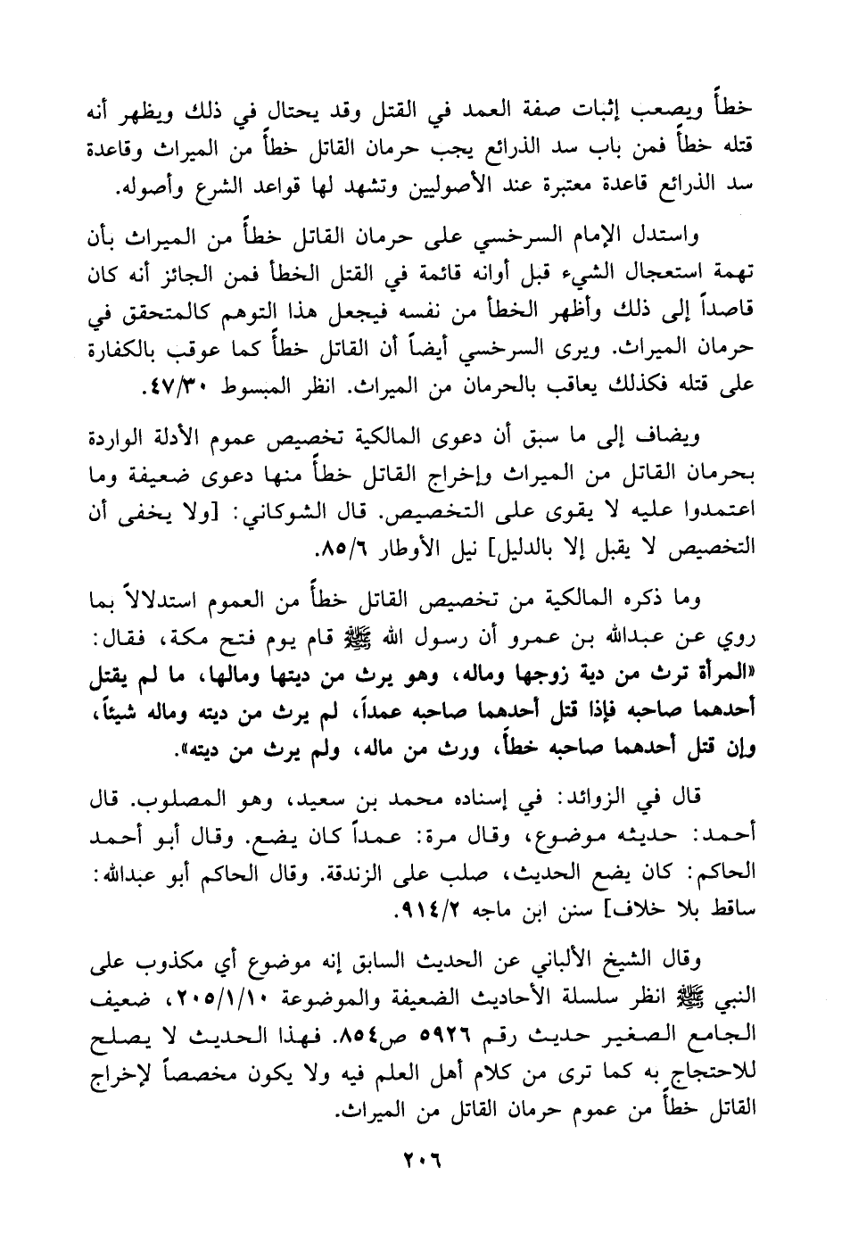 وقال الشيخ الألباني عن الحديث السابق إنه موضوع أي مكذوب على النبي - صَلَّى اللهُ عَلَيْهِ وَسَلَّمَ - انظر سلسلة الأحاديث الضعيفة والموضوعة 10/ 1/205، ضعيف الجامع الصغير حديث رقم 5926 ص854. فهذا الحديث لا يصلح للاحتجاج به كما ترى من كلام أهل العلم فيه ولا يكون مخصصاً لإخراج القاتل خطأً من عموم حرمان القاتل من الميراث.