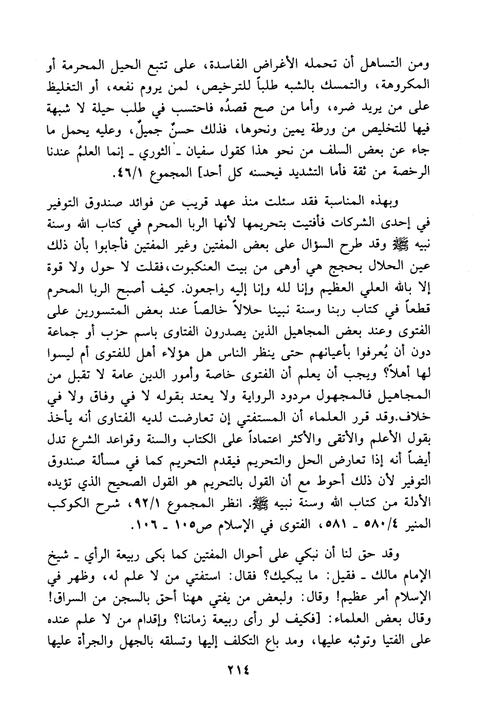 وبهذه المناسبة فقد سئلت منذ عهد قريب عن فوائد صندوق التوفير في إحدى الشركات فأفتيت بتحريمها لأنها الربا المحرم في كتاب الله وسنة نبيه - صَلَّى اللهُ عَلَيْهِ وَسَلَّمَ - وقد طرح السؤال على بعض المفتين وغير المفتين فأجابوا بأن ذلك عين الحلال بحجج هي أوهى من بيت العنكبوت، فقلت لا حول ولا قوة إلا بالله العلي العظيم وإنا لله وإنا إليه راجعون. كيف أصبح الربا المحرم قطعاً في كتاب ربنا وسنة نبينا حلالاً خالصاً عند بعض المتسورين على الفتوى وعند بعض المجاهيل الذين يصدرون الفتاوى باسم حزب أو جماعة دون أن يُعرفوا بأعيانهم حتى ينظر الناس هل هؤلاء أهل للفتوى أم ليسوا لها أهلاً؟ ويجب أن يعلم أن الفتوى خاصة وأمور الدين عامة لا تقبل من المجاهيل فالمجهول مردود الرواية ولا يعتد بقوله لا في وفاق ولا في خلاف. وقد قرر العلماء أن المستفتي إن تعارضت لديه الفتاوى أنه يأخذ بقول الأعلم والأتقى والأكثر اعتماداً على الكتاب والسنة وقواعد الشرع تدل أيضاً أنه إذا تعارض الحل والتحريم فيقدم التحريم كما في مسألة صندوق التوفير لأن ذلك أحوط مع أن القول بالتحريم هو القول الصحيح الذي تؤيده الأدلة من كتاب الله وسنة نبيه - صَلَّى اللهُ عَلَيْهِ وَسَلَّمَ -. انظر المجموع 1/ 92، شرح الكوكب المنير 4/ 580 - 581، الفتوى في الإسلام ص105 - 106.