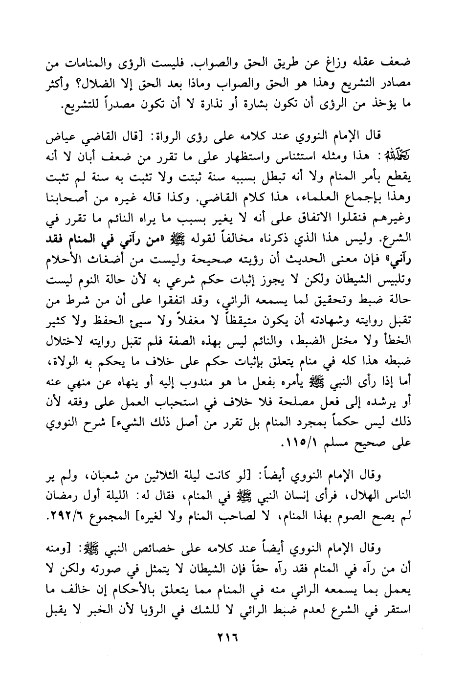 وقال الإمام النووي أيضاً عند كلامه على خصائص النبي - صَلَّى اللهُ عَلَيْهِ وَسَلَّمَ -: [ومنه أن من رآه في المنام فقد رآه حقاً فإن الشيطان لا يتمثل في صورته ولكن لا يعمل بما يسمعه الرائي منه في المنام مما يتعلق بالأحكام إن خالف ما استقر في الشرع لعدم ضبط الرائي لا للشك في الرؤيا لأن الخبر لا يقبل