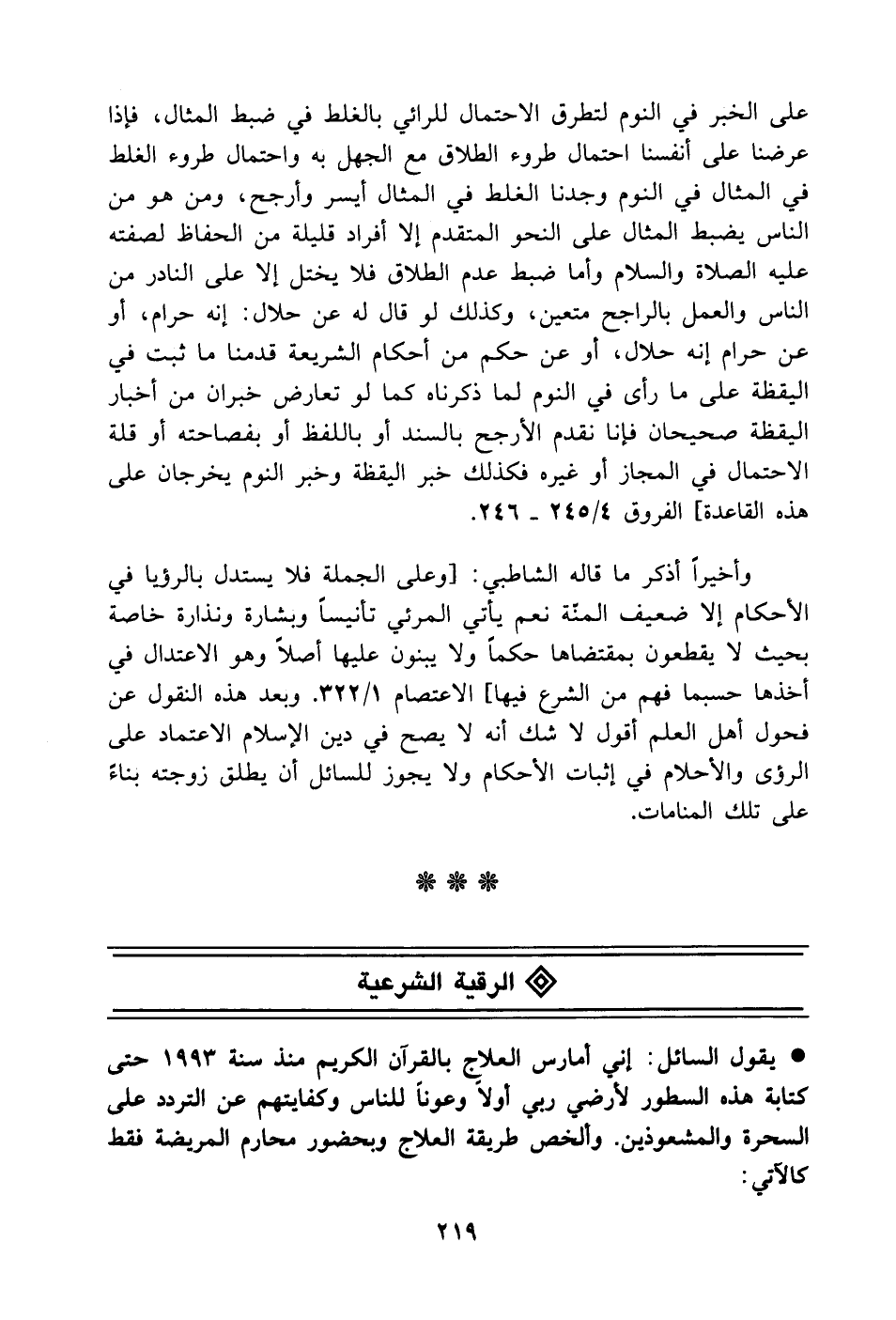 وأخيراً أذكر ما قاله الشاطبي: [وعلى الجملة فلا يستدل بالرؤيا في الأحكام إلا ضعيف المنّة نعم يأتي المرئي تأنيساً وبشارة ونذارة خاصة بحيث لا يقطعون بمقتضاها حكماً ولا يبنون عليها أصلاً وهو الاعتدال في أخذها حسبما فهم من الشرع فيها] الاعتصام 1/ 322. وبعد هذه النقول عن فحول أهل العلم أقول لا شك أنه لا يصح في دين الإسلام الاعتماد على الرؤى والأحلام في إثبات الأحكام ولا يجوز للسائل أن يطلق زوجته بناءً على تلك المنامات.