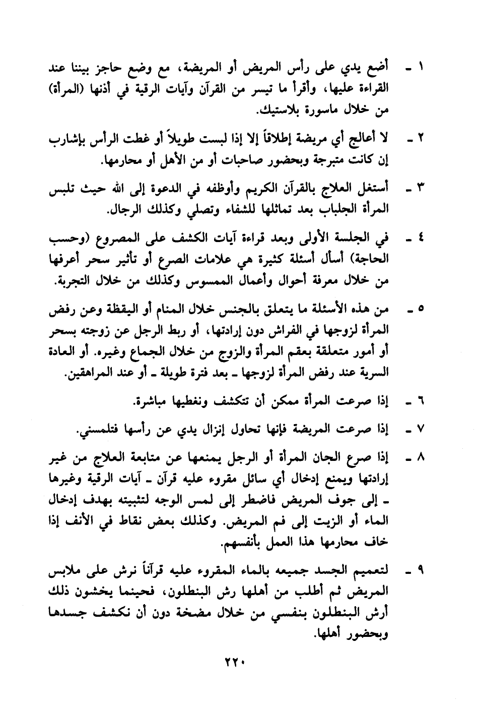أضع يدي على رأس المريض أو المريضة، مع وضع حاجز بيننا عند القراءة عليها، وأقرأ ما تيسر من القرآن وآيات الرقية في أذنها (المرأة) من خلال ماسورة بلاستيك.