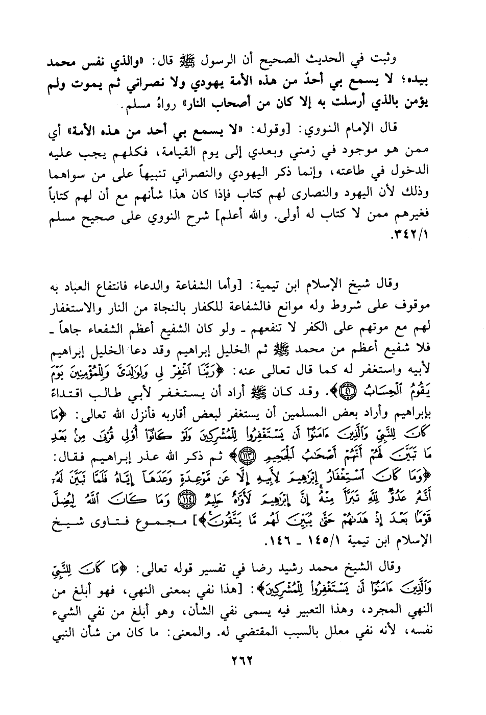 وقال شيخ الإسلام ابن تيمية: [وأما الشفاعة والدعاء فانتفاع العباد به موقوف على شروط وله موانع فالشفاعة للكفار بالنجاة من النار والاستغفار لهم مع موتهم على الكفر لا تنفعهم -ولو كان الشفيع أعظم الشفعاء جاهاً- فلا شفيع أعظم من محمد - صَلَّى اللهُ عَلَيْهِ وَسَلَّمَ - ثم الخليل إبراهيم وقد دعا الخليل إبراهيم لأبيه واستغفر له كما قال تعالى عنه: {رَبَّنَا اغْفِرْ لِي وَلِوَالِدَيَّ وَلِلْمُؤْمِنِينَ يَوْمَ يَقُومُ الْحِسَابُ}. وقد كان - صَلَّى اللهُ عَلَيْهِ وَسَلَّمَ - أراد أن يستغفر لأبي طالب اقتداءً بإبراهيم وأراد بعض المسلمين أن يستغفر لبعض أقاربه فأنزل الله تعالى: {مَا كَانَ لِلنَّبِيِّ وَالَّذِينَ آمَنُوا أَنْ يَسْتَغْفِرُوا لِلْمُشْرِكِينَ وَلَوْ كَانُوا أُولِي قُرْبَى مِنْ بَعْدِ مَا تَبَيَّنَ لَهُمْ أَنَّهُمْ أَصْحَابُ الْجَحِيمِ} ثم ذكر الله عذر إبراهيم فقال: {وَمَا كَانَ اسْتِغْفَارُ إبْرَاهِيمَ لِأَبِيهِ إلَّا عَنْ مَوْعِدَةٍ وَعَدَهَا إيَّاهُ فَلَمَّا تَبَيَّنَ لَهُ أَنَّهُ عَدُوٌّ لِلَّهِ تَبَرَّأَ مِنْهُ إنَّ إبْرَاهِيمَ لَأَوَّاهٌ حَلِيمٌ وَمَا كَانَ اللَّهُ لِيُضِلَّ قَوْمًا بَعْدَ إذْ هَدَاهُمْ حَتَّى يُبَيِّنَ لَهُمْ مَا يَتَّقُونَ}] مجموع فتاوى شيخ الإسلام ابن تيمية 1/ 145 - 146.
