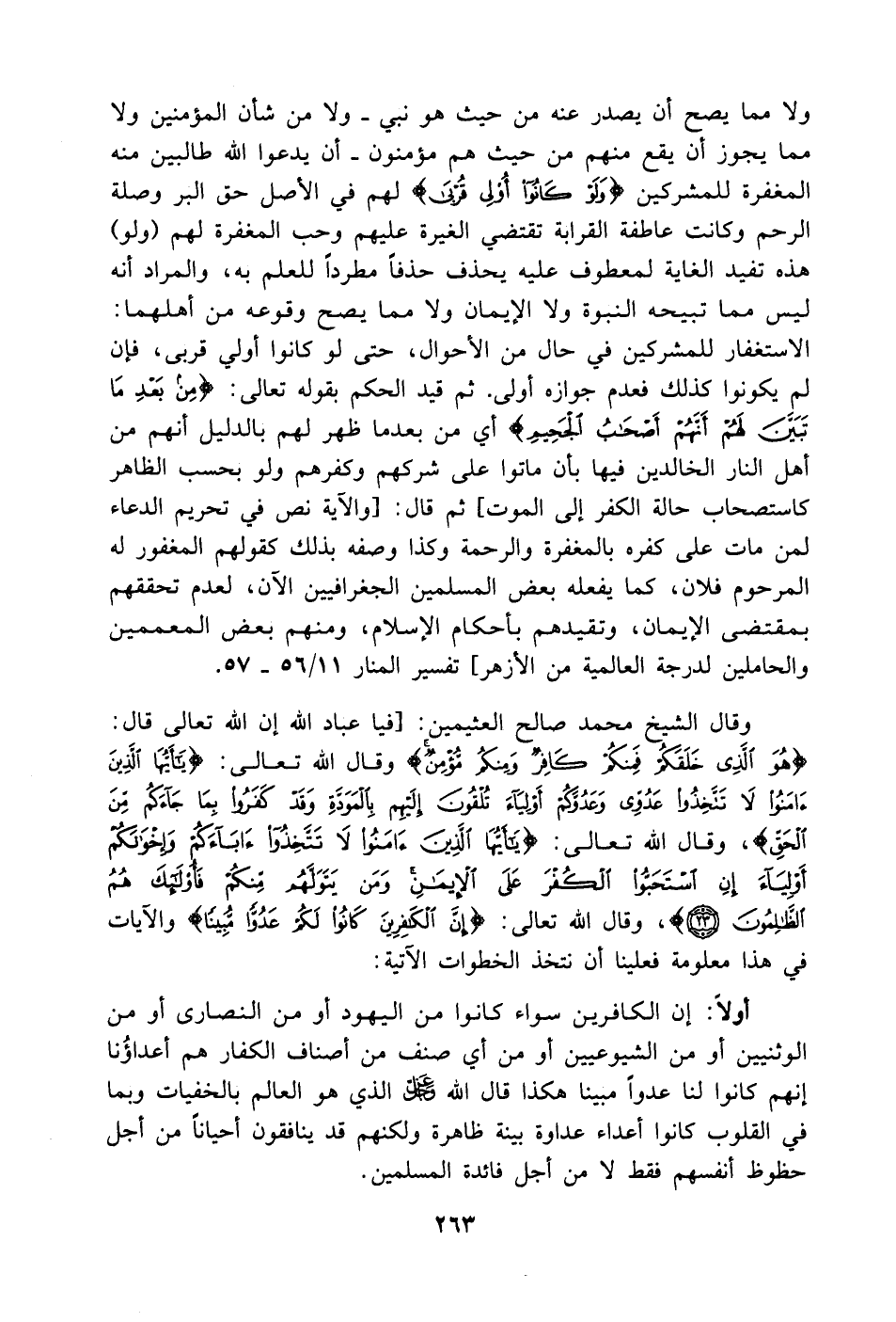 وقال الشيخ محمد صالح العثيمين: [فيا عباد الله إن الله تعالى قال: {هُوَ الَّذِي خَلَقَكُمْ فَمِنْكُمْ كَافِرٌ وَمِنْكُمْ مُؤْمِنٌ} وقال الله تعالى: {يَا أَيُّهَا الَّذِينَ آمَنُوا لَا تَتَّخِذُوا عَدُوِّي وَعَدُوَّكُمْ أَوْلِيَاءَ تُلْقُونَ إِلَيْهِمْ بِالْمَوَدَّةِ وَقَدْ كَفَرُوا بِمَا جَاءَكُمْ مِنْ الْحَقِّ} وقال الله تعالى: {يَاأَيُّهَا الَّذِينَ آمَنُوا لَا تَتَّخِذُوا آبَاءَكُمْ وَإِخْوَانَكُمْ أَوْلِيَاءَ إِنْ اسْتَحَبُّوا الْكُفْرَ عَلَى الْإِيمَانِ وَمَنْ يَتَوَلَّهُمْ مِنْكُمْ فَأُوْلَئِكَ هُمْ الظَّالِمُونَ} وقال الله تعالى: {ِإنَّ الْكَافِرِينَ كَانُوا لَكُمْ عَدُوًّا مُبِينًا} والآيات في هذا معلومة فعلينا أن نتخذ الخطوات الآتية: إن الكافرين سواء كانوا من اليهود أو من النصارى أو من الوثنيين أو من الشيوعيين أو من أي صنف من أصناف الكفار هم أعداؤُنا إنهم كانوا لنا عدواً مبينا هكذا قال الله عز وجل الذي هو العالم بالخفيات وبما في القلوب كانوا أعداء عداوة بينة ظاهرة ولكنهم قد ينافقون أحياناً من أجل حظوظ أنفسهم فقط لا من أجل فائدة المسلمين.