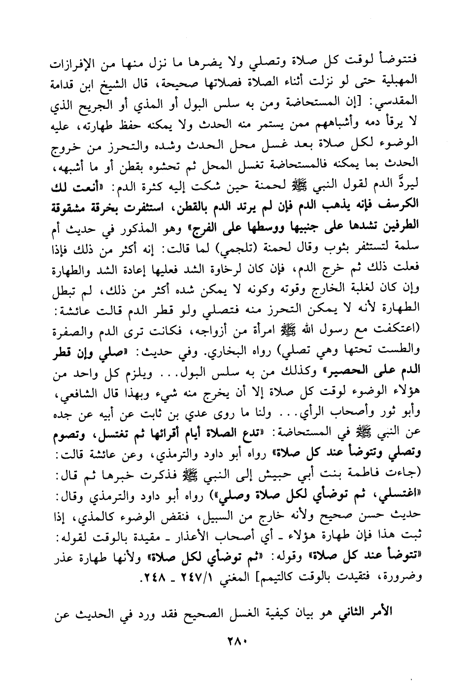 داود والترمذي وقال: حديث حسن صحيح ولأنه خارج من السبيل، فنقض الوضوء كالمذي، إذا ثبت هذا فإن طهارة هؤلاء -أي أصحاب الأعذار- مقيدة بالوقت لقوله: (تتوضأ عند كل صلاة) وقوله: (ثم توضأي لكل صلاة) ولأنها طهارة عذر وضرورة، فتقيدت بالوقت كالتيمم] المغني 1/ 247 - 248.