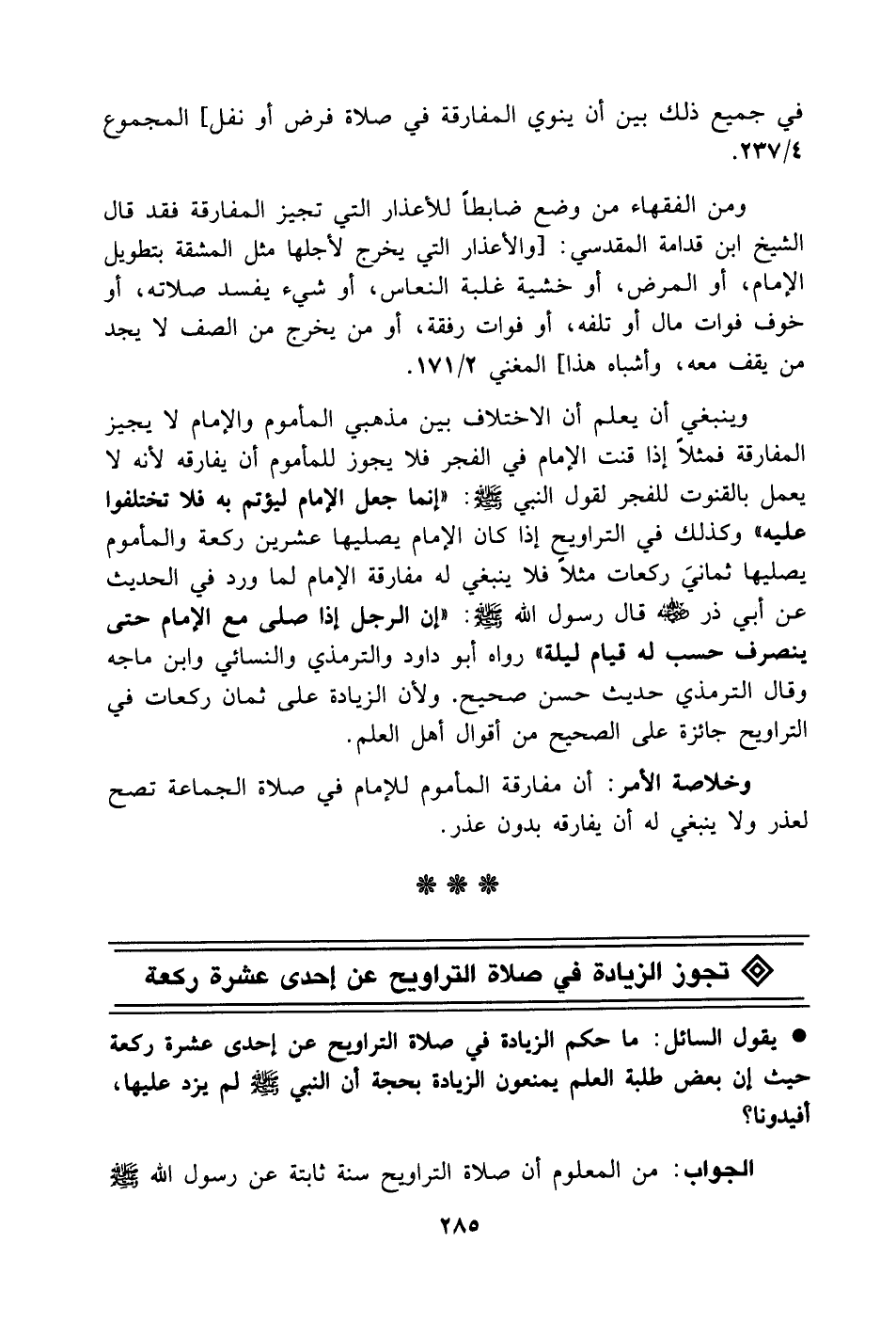 وينبغي أن يعلم أن الاختلاف بين مذهبي المأموم والإمام لا يجيز المفارقة فمثلاً إذا قنت الإمام في الفجر فلا يجوز للمأموم أن يفارقه لأنه لا يعمل بالقنوت للفجر لقول النبي - صَلَّى اللهُ عَلَيْهِ وَسَلَّمَ -: (إنما جعل الإمام ليؤتم به فلا تختلفوا عليه) وكذلك في التراويح إذا كان الإمام يصليها عشرين ركعة والمأموم يصليها ثمانيَ ركعات مثلاً فلا ينبغي له مفارقة الإمام لما ورد في الحديث عن أبي ذر - رضي الله عنه - قال رسول الله - صَلَّى اللهُ عَلَيْهِ وَسَلَّمَ -: (إن الرجل إذا صلى مع الإمام حتى ينصرف حسب له قيام ليلة) رواه أبو داود والترمذي والنسائي وابن ماجة وقال الترمذي حديث حسن صحيح. ولأن الزيادة على ثمان ركعات في التراويح جائزة على الصحيح من أقوال أهل العلم.