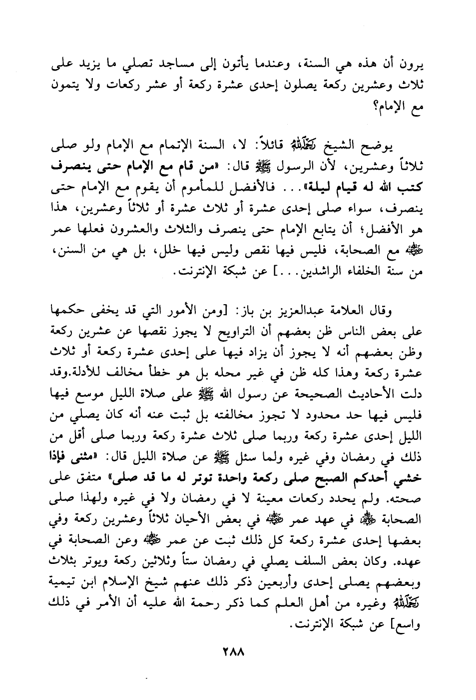 وقال العلامة عبد العزيز بن باز: [ومن الأمور التي قد يخفى حكمها على بعض الناس ظن بعضهم أن التراويح لا يجوز نقصها عن عشرين ركعة وظن بعضهم أنه لا يجوز أن يزاد فيها على إحدى عشرة ركعة أو ثلاث عشرة ركعة وهذا كله ظن في غير محله بل هو خطأ مخالف للأدلة. وقد دلت الأحاديث الصحيحة عن رسول الله- صَلَّى اللهُ عَلَيْهِ وَسَلَّمَ - على صلاة الليل موسع فيها فليس فيها حد محدود لا تجوز مخالفته بل ثبت عنه أنه كان يصلي من الليل إحدى عشرة ركعة وربما صلى ثلاث عشرة ركعة وربما صلى أقل من ذلك في رمضان وفي غيره ولما سئل - صَلَّى اللهُ عَلَيْهِ وَسَلَّمَ - عن صلاة الليل قال: (مثنى فإذا خشي أحدكم الصبح صلى ركعة واحدة توتر له ما قد صلى) متفق على صحته. ولم يحدد ركعات معينة لا في رمضان ولا في غيره ولهذا صلى الصحابة رضي الله عنهم في عهد عمر - رضي الله عنه -في بعض الأحيان ثلاثاً وعشرين ركعة وفي بعضها إحدى عشرة ركعة كل ذلك ثبت عن عمر - رضي الله عنه - وعن الصحابة في عهده. وكان بعض السلف يصلي في رمضان ستاً وثلاثين ركعة ويوتر بثلاث وبعضهم يصلى إحدى وأربعين ذكر ذلك عنهم شيخ الإسلام ابن تيمية رحمه الله وغيره من أهل العلم كما ذكر رحمة الله عليه أن الأمر في ذلك واسع] عن شبكة الإنترنت.