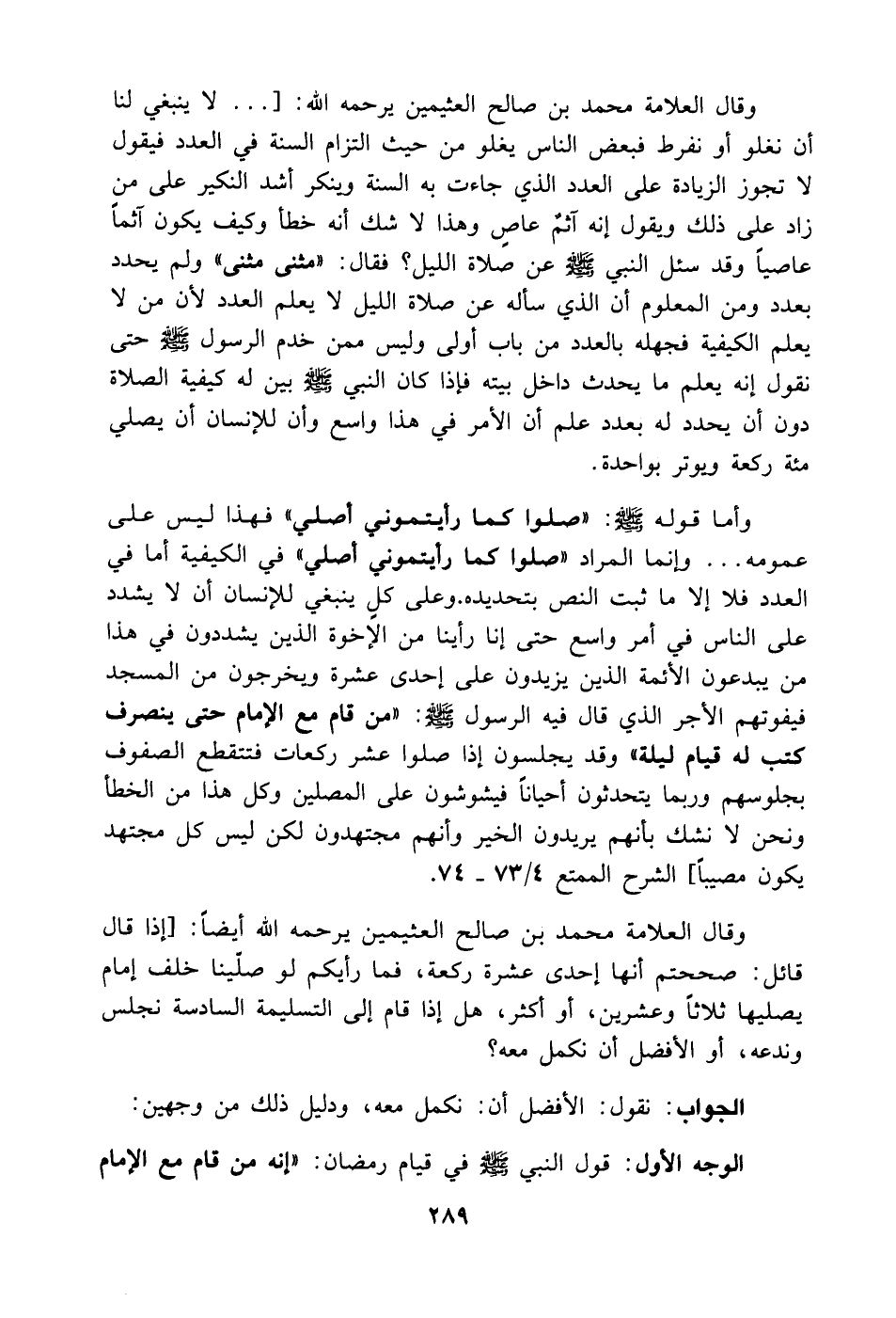 وأما قوله - صَلَّى اللهُ عَلَيْهِ وَسَلَّمَ -: (صلوا كما رأيتموني أصلي) فهذا ليس على عمومه ... وإنما المراد (صلوا كما رأيتموني أصلي) في الكيفية أما في العدد فلا إلا ما ثبت النص بتحديده. وعلى كلٍ ينبغي للإنسان أن لا يشدد على الناس في أمر واسع حتى إنا رأينا من الإخوة الذين يشددون في هذا من يبدعون الأئمة الذين يزيدون على إحدى عشرة ويخرجون من المسجد فيفوتهم الأجر الذي قال فيه الرسول - صَلَّى اللهُ عَلَيْهِ وَسَلَّمَ -: (من قام مع الإمام