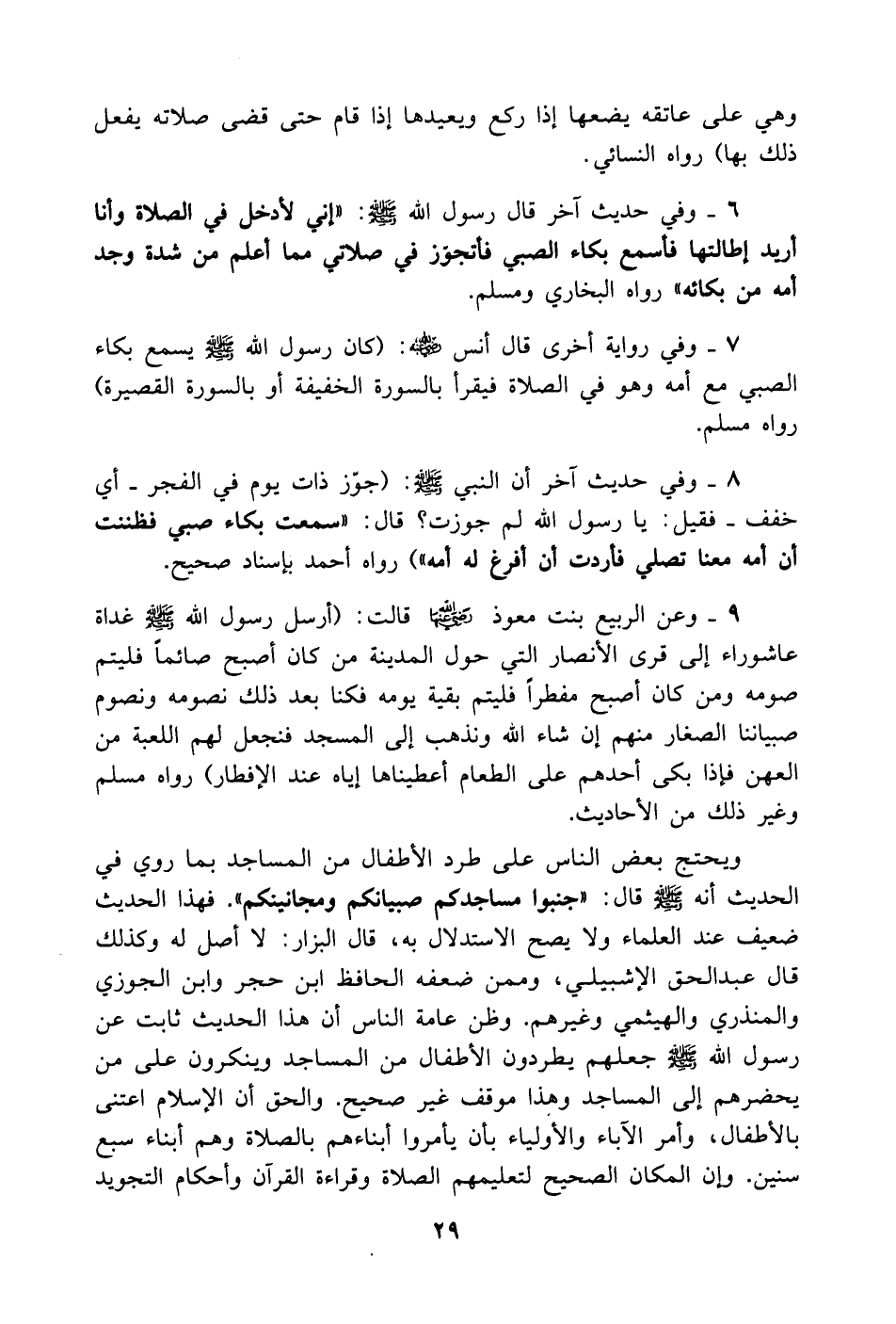 ويحتج بعض الناس على طرد الأطفال من المساجد بما روي في الحديث أنه - صَلَّى اللهُ عَلَيْهِ وَسَلَّمَ - قال: (جنبوا مساجدكم صبيانكم ومجانينكم). فهذا الحديث ضعيف عند العلماء ولا يصح الاستدلال به، قال البزار: لا أصل له وكذلك قال عبد الحق الإشبيلي، وممن ضعفه الحافظ ابن حجر وابن الجوزي والمنذري والهيثمي وغيرهم. وظن عامة الناس أن هذا الحديث ثابت عن رسول الله - صَلَّى اللهُ عَلَيْهِ وَسَلَّمَ - جعلهم يطردون الأطفال من المساجد وينكرون على من يحضرهم إلى المساجد وهذا موقف غير صحيح. والحق أن الإسلام اعتنى بالأطفال، وأمر الآباء والأولياء بأن يأمروا أبناءهم بالصلاة وهم أبناء سبع سنين. وإن المكان الصحيح لتعليمهم الصلاة وقراءة القرآن وأحكام التجويد
