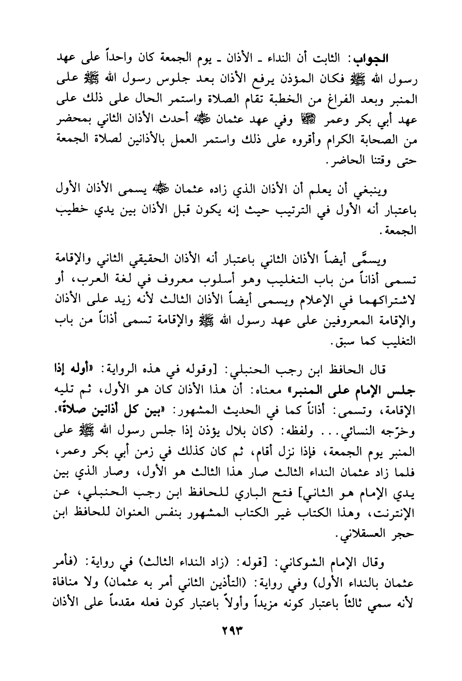 وقال الإمام الشوكاني: [قوله: (زاد النداء الثالث) في رواية: (فأمر عثمان بالنداء الأول) وفي رواية: (التأذين الثاني أمر به عثمان) ولا منافاة لأنه سمي ثالثاً باعتبار كونه مزيداً وأولاً باعتبار كون فعله مقدماً على الأذان