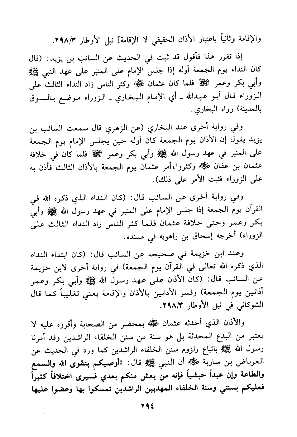 وفي رواية أخرى عند البخاري (عن الزهري قال سمعت السائب بن يزيد يقول إن الأذان يوم الجمعة كان أوله حين يجلس الإمام يوم الجمعة على المنبر في عهد رسول الله - صَلَّى اللهُ عَلَيْهِ وَسَلَّمَ - وأبي بكر وعمر رضي الله عنهما فلما كان في خلافة عثمان بن عفان - رضي الله عنه - وكثروا، أمر عثمان يوم الجمعة بالأذان الثالث فأذن به على الزوراء فثبت الأمر على ذلك).