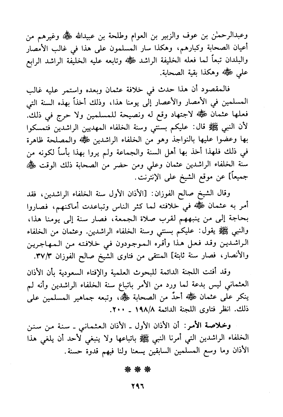 وقال الشيخ صالح الفوزان: [الأذان الأول سنة الخلفاء الراشدين، فقد أمر به عثمان - رضي الله عنه - في خلافته لما كثر الناس وتباعدت أماكنهم، فصاروا بحاجة إلى من ينبههم لقرب صلاة الجمعة، فصار سنة إلى يومنا هذا، والنبي - صَلَّى اللهُ عَلَيْهِ وَسَلَّمَ - يقول: عليكم بسنتي وسنة الخلفاء الراشدين. وعثمان من الخلفاء الراشدين وقد فعل هذا وأقره الموجودون في خلافته من المهاجرين والأنصار، فصار سنة ثابتة] المنتقى من فتاوى الشيخ صالح الفوزان 3/ 37.