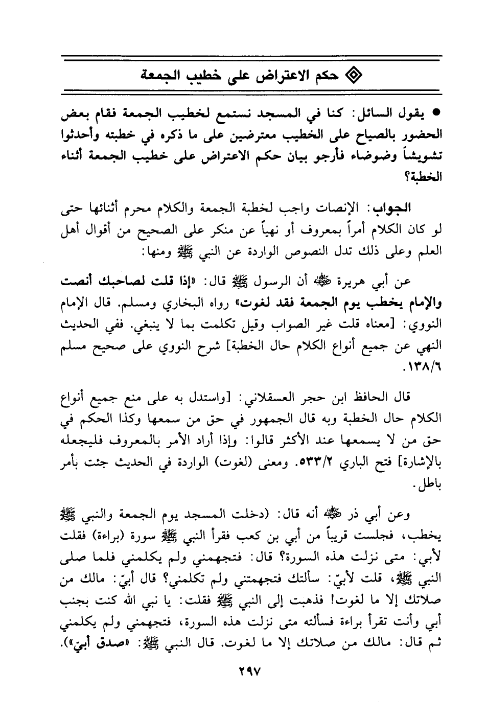 عن أبي هريرة - رضي الله عنه - أن الرسول - صَلَّى اللهُ عَلَيْهِ وَسَلَّمَ - قال: (إذا قلت لصاحبك أنصت والإمام يخطب يوم الجمعة فقد لغوت) رواه البخاري ومسلم. قال الإمام النووي: [معناه قلت غير الصواب وقيل تكلمت بما لا ينبغي. ففي الحديث النهي عن جميع أنواع الكلام حال الخطبة] شرح النووي على صحيح مسلم 6/ 138.