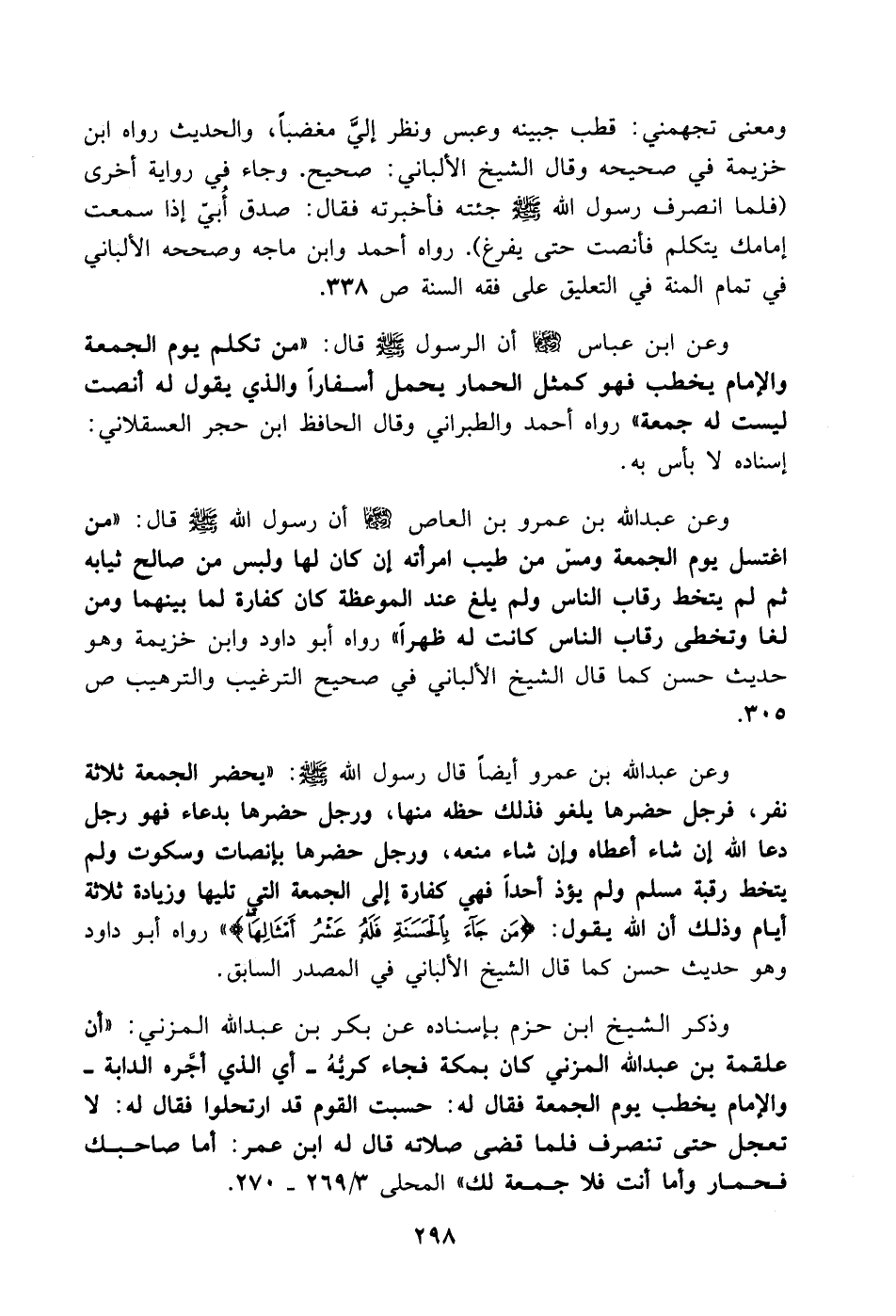 وعن ابن عباس رضي الله عنهما أن الرسول - صَلَّى اللهُ عَلَيْهِ وَسَلَّمَ - قال: (من تكلم يوم الجمعة والإمام يخطب فهو كمثل الحمار يحمل أسفاراً والذي يقول له أنصت ليست له جمعة) رواه أحمد والطبراني وقال الحافظ ابن حجر العسقلاني: إسناده لا بأس به.