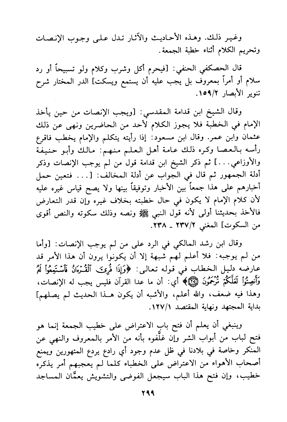 وقال الشيخ ابن قدامة المقدسي: [ويجب الإنصات من حين يأخذ الإمام في الخطبة فلا يجوز الكلام لأحد من الحاضرين ونهى عن ذلك عثمان وابن عمر. وقال ابن مسعود: إذا رأيته يتكلم والإمام يخطب فاقرع رأسه بالعصا وكره ذلك عامة أهل العلم منهم: مالك وأبو حنيفة والأوزاعي ... ] ثم ذكر الشيخ ابن قدامة قول من لم يوجب الإنصات وذكر أدلة الجمهور ثم قال في الجواب عن أدلة المخالف: [ ... فتعين حمل أخبارهم على هذا جمعاً بين الأخبار وتوفيقاً بينها ولا يصح قياس غيره عليه لأن كلام الإمام لا يكون في حال خطبته بخلاف غيره وإن قدر التعارض فالأخذ بحديثنا أولى لأنه قول النبي - صَلَّى اللهُ عَلَيْهِ وَسَلَّمَ - ونصه وذلك سكوته والنص أقوى من السكوت] المغني 2/ 237 - 238.