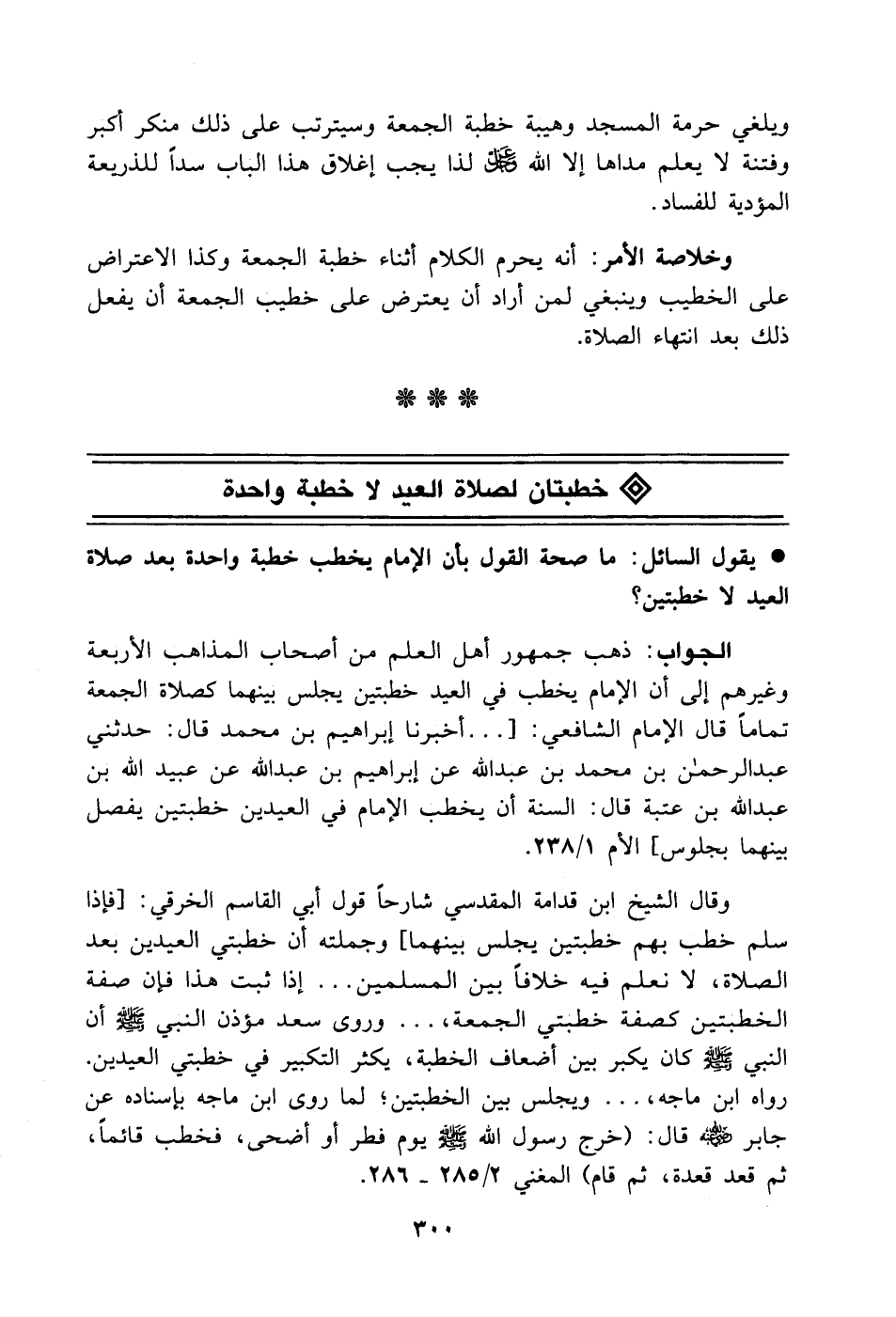وقال الشيخ ابن قدامة المقدسي شارحاً قول أبي القاسم الخرقي: [فإذا سلم خطب بهم خطبتين يجلس بينهما] وجملته أن خطبتي العيدين بعد الصلاة، لا نعلم فيه خلافاً بين المسلمين ... إذا ثبت هذا فإن صفة الخطبتين كصفة خطبتي الجمعة، ... وروى سعد مؤذن النبي - صَلَّى اللهُ عَلَيْهِ وَسَلَّمَ - أن النبي - صَلَّى اللهُ عَلَيْهِ وَسَلَّمَ - كان يكبر بين أضعاف الخطبة، يكثر التكبير في خطبتي العيدين. رواه ابن ماجه، ... ويجلس بين الخطبتين؛ لما روى ابن ماجه بإسناده عن جابر - رضي الله عنه -قال: (خرج رسول الله - صَلَّى اللهُ عَلَيْهِ وَسَلَّمَ - يوم فطر أو أضحى، فخطب قائماً، ثم قعد قعدة، ثم قام] المغني 2/ 285 - 286.