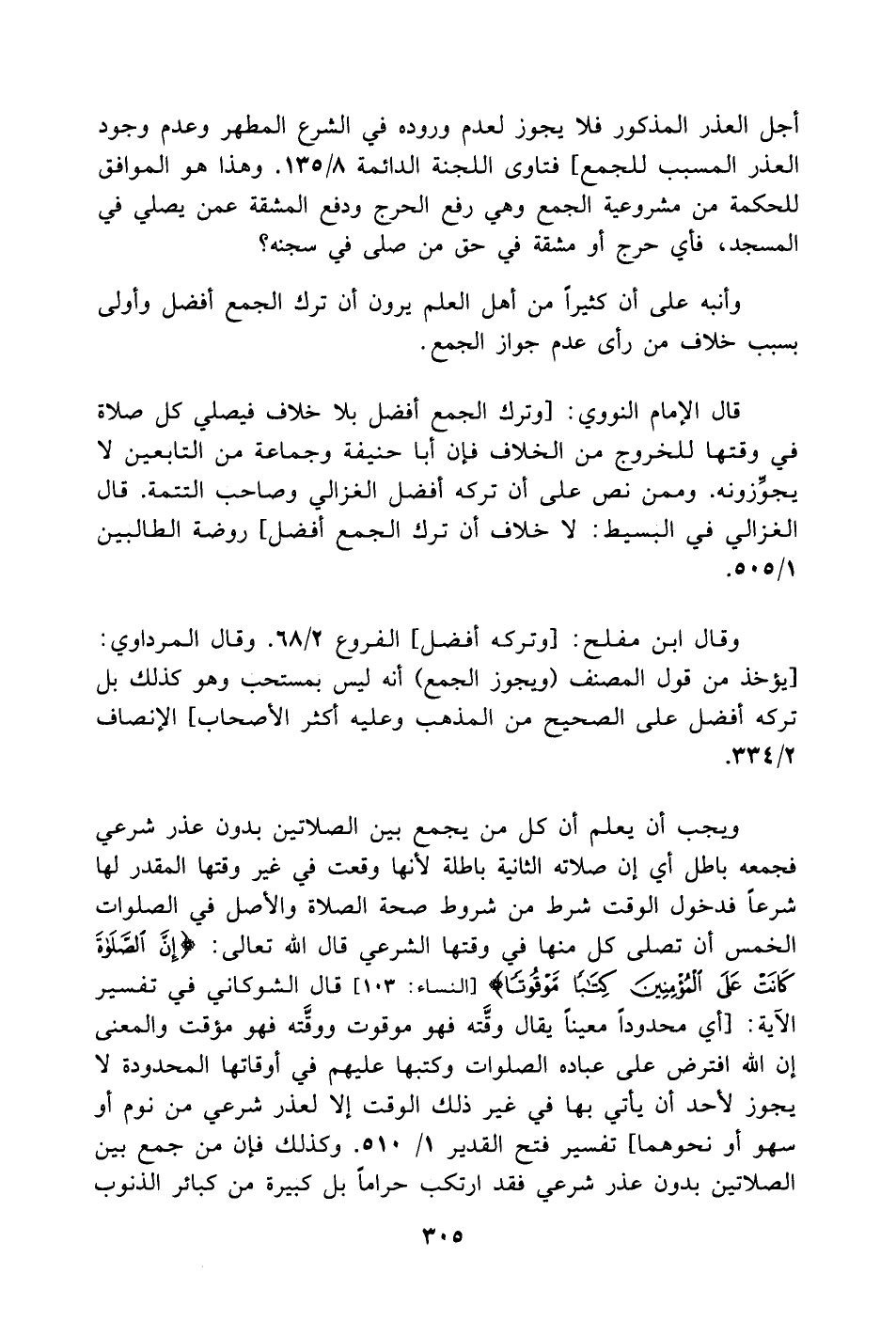 ويجب أن يعلم أن كل من يجمع بين الصلاتين بدون عذر شرعي فجمعه باطل أي إن صلاته الثانية باطلة لأنها وقعت في غير وقتها المقدر لها شرعاً فدخول الوقت شرط من شروط صحة الصلاة والأصل في الصلوات الخمس أن تصلى كل منها في وقتها الشرعي قال الله تعالى: {إِنَّ الصَّلَاةَ كَانَتْ عَلَى الْمُؤْمِنِينَ كِتَابًا مَوْقُوتًا} سورة النساء الآية 103. قال الشوكاني في تفسير الآية: [أي محدوداً معيناً يقال وقَّته فهو موقوت ووقَّته فهو مؤقت والمعنى إن الله افترض على عباده الصلوات وكتبها عليهم في أوقاتها المحدودة لا يجوز لأحد أن يأتي بها في غير ذلك الوقت إلا لعذر شرعي من نوم أو سهو أو نحوهما] تفسير فتح القدير 1/ 510. وكذلك فإن من جمع بين الصلاتين بدون عذر شرعي فقد ارتكب حراماً بل كبيرة من كبائر الذنوب