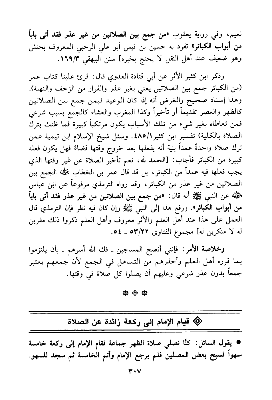وذكر ابن كثير الأثر عن أبي قتادة العدوى قال: قرئ علينا كتاب عمر (من الكبائر جمع بين الصلاتين يعني بغير عذر والفرار من الزحف والنهبة). وهذا إسناد صحيح والغرض أنه إذا كان الوعيد فيمن جمع بين الصلاتين كالظهر والعصر تقديماً أو تأخيراً وكذا المغرب والعشاء كالجمع بسبب شرعي فمن تعاطاه بغير شيء من تلك الأسباب يكون مرتكباً كبيرة فما ظنك بترك الصلاة بالكلية) تفسير ابن كثير1/ 485. وسئل شيخ الإسلام ابن تيمية عمن ترك صلاة واحدةً عمداً بنية أنه يفعلها بعد خروج وقتها قضاءً فهل يكون فعله كبيرة من الكبائر فأجاب: [الحمد لله، نعم تأخير الصلاة عن غير وقتها الذي يجب فعلها فيه عمداً من الكبائر، بل قد قال عمر بن الخطاب - رضي الله عنه - الجمع بين الصلاتين من غير عذر من الكبائر، وقد رواه الترمذى مرفوعاً عن ابن عباس - رضي الله عنه - عن النبي - صَلَّى اللهُ عَلَيْهِ وَسَلَّمَ - أنه قال: (من جمع بين الصلاتين من غير عذر فقد أتى باباً من أبواب الكبائر). ورفع هذا إلى النبي - صَلَّى اللهُ عَلَيْهِ وَسَلَّمَ - وإن كان فيه نظر فإن الترمذي قال العمل على هذا عند أهل العلم والأثر معروف وأهل العلم ذكروا ذلك مقرين له لا منكرين له] مجموع الفتاوى 22/ 53 - 54.
