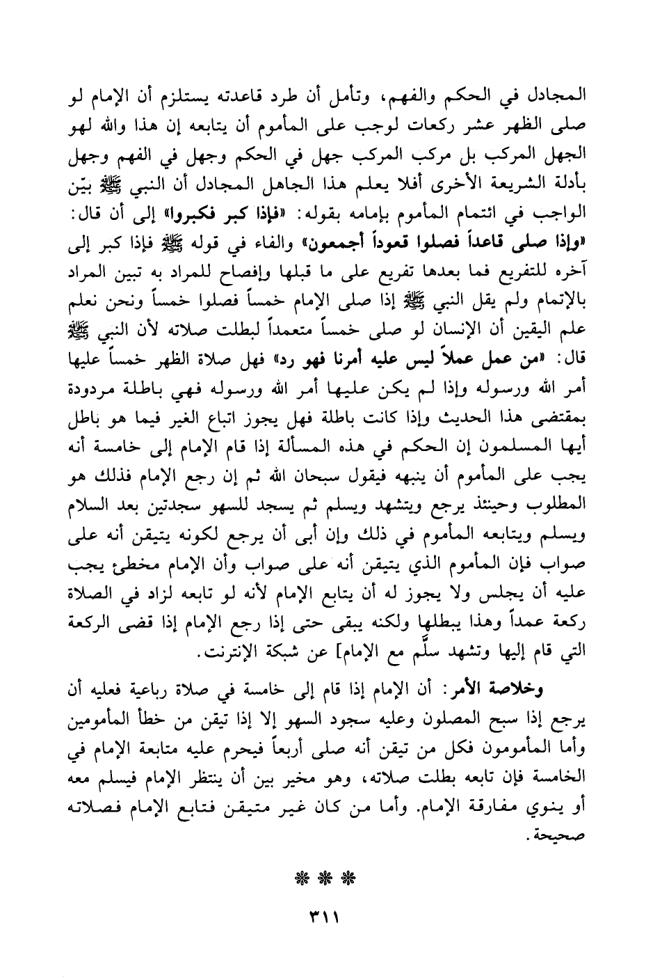 المجادل في الحكم والفهم، وتأمل أن طرد قاعدته يستلزم أن الإمام لو صلى الظهر عشر ركعات لوجب على المأموم أن يتابعه إن هذا والله لهو الجهل المركب بل مركب المركب جهل في الحكم وجهل في الفهم وجهل بأدلة الشريعة الأخرى أفلا يعلم هذا الجاهل المجادل أن النبي - صَلَّى اللهُ عَلَيْهِ وَسَلَّمَ - بيّن الواجب في إئتمام المأموم بإمامه بقوله: (فإذا كبر فكبروا) إلى أن قال: (وإذا صلى قاعداً فصلوا قعوداً أجمعون) والفاء في قوله - صَلَّى اللهُ عَلَيْهِ وَسَلَّمَ - فإذا كبر إلى آخره للتفريع فما بعدها تفريع على ما قبلها وإفصاح للمراد به تبين المراد بالإتمام ولم يقل النبي - صَلَّى اللهُ عَلَيْهِ وَسَلَّمَ - إذا صلى الإمام خمساً فصلوا خمساً ونحن نعلم علم اليقين أن الإنسان لو صلى خمساً متعمداً لبطلت صلاته لأن النبي - صَلَّى اللهُ عَلَيْهِ وَسَلَّمَ - قال: (من عمل عملاً ليس عليه أمرنا فهو رد) فهل صلاة الظهر خمساً عليها أمر الله ورسوله وإذا لم يكن عليها أمر الله ورسوله فهي باطلة مردودة بمقتضى هذا الحديث وإذا كانت باطلة فهل يجوز إتباع الغير فيما هو باطل أيها المسلمون إن الحكم في هذه المسألة إذا قام الإمام إلى خامسة أنه يجب على المأموم أن ينبهه فيقول سبحان الله ثم إن رجع الإمام فذلك هو المطلوب وحينئذ يرجع ويتشهد ويسلم ثم يسجد للسهو سجدتين بعد السلام ويسلم ويتابعه المأموم في ذلك وإن أبى أن يرجع لكونه يتيقن أنه على صواب فإن المأموم الذي يتيقن أنه على صواب وأن الإمام مخطئ يجب عليه أن يجلس ولا يجوز له أن يتابع الإمام لأنه لو تابعه لزاد في الصلاة ركعة عمداً وهذا يبطلها ولكنه يبقى حتى إذا رجع الإمام إذا قضى الركعة التي قام إليها وتشهد سلَّم مع الإمام] عن شبكة الإنترنت.