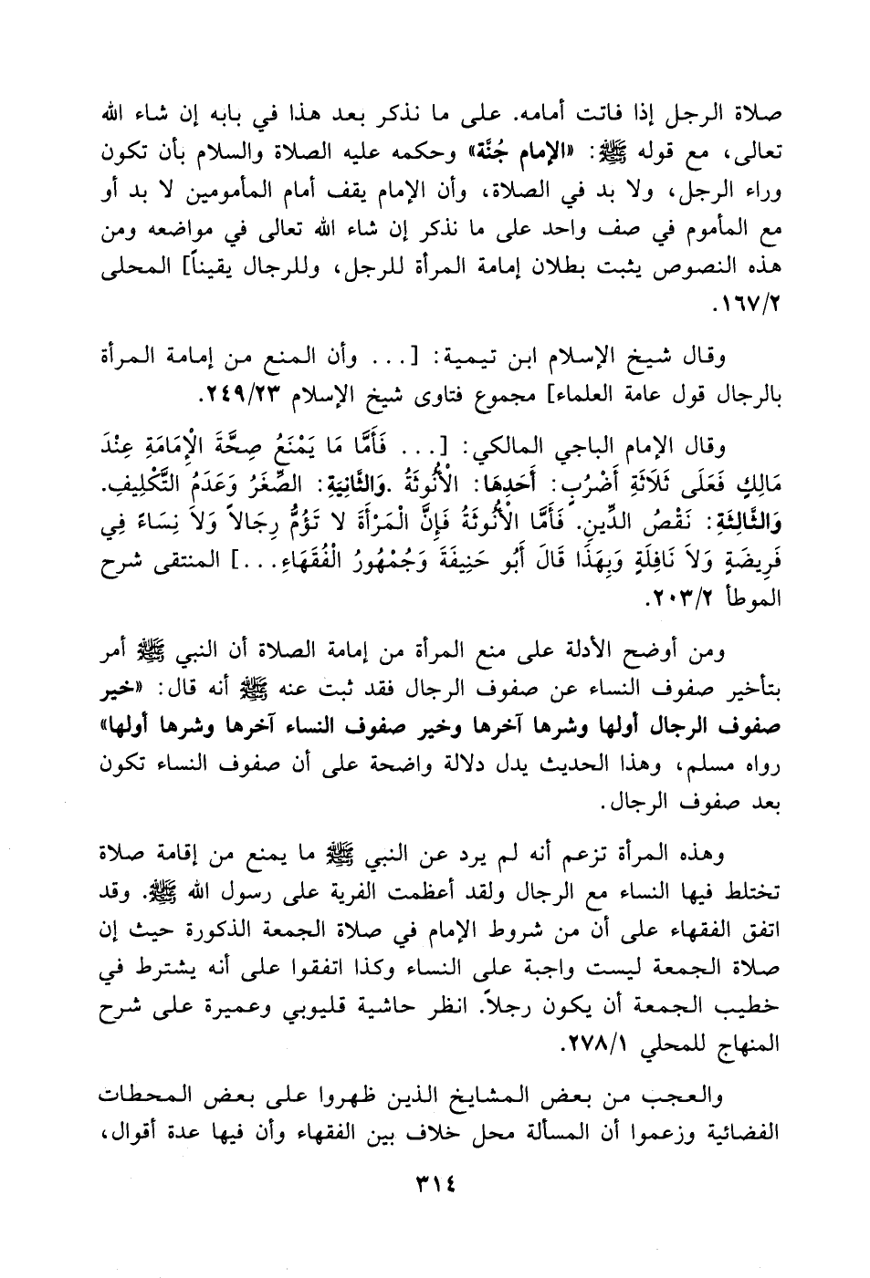 صلاة الرجل إذا فاتت أمامه. على ما نذكر بعد هذا في بابه إن شاء الله تعالى، مع قوله - صَلَّى اللهُ عَلَيْهِ وَسَلَّمَ -: (الإمام جُنَّة) وحكمه عليه الصلاة والسلام بأن تكون وراء الرجل، ولا بد في الصلاة، وأن الإمام يقف أمام المأمومين لا بد أو مع المأموم في صف واحد على ما نذكر إن شاء الله تعالى في مواضعه ومن هذه النصوص يثبت بطلان إمامة المرأة للرجل، وللرجال يقيناً] المحلى 2/ 167.