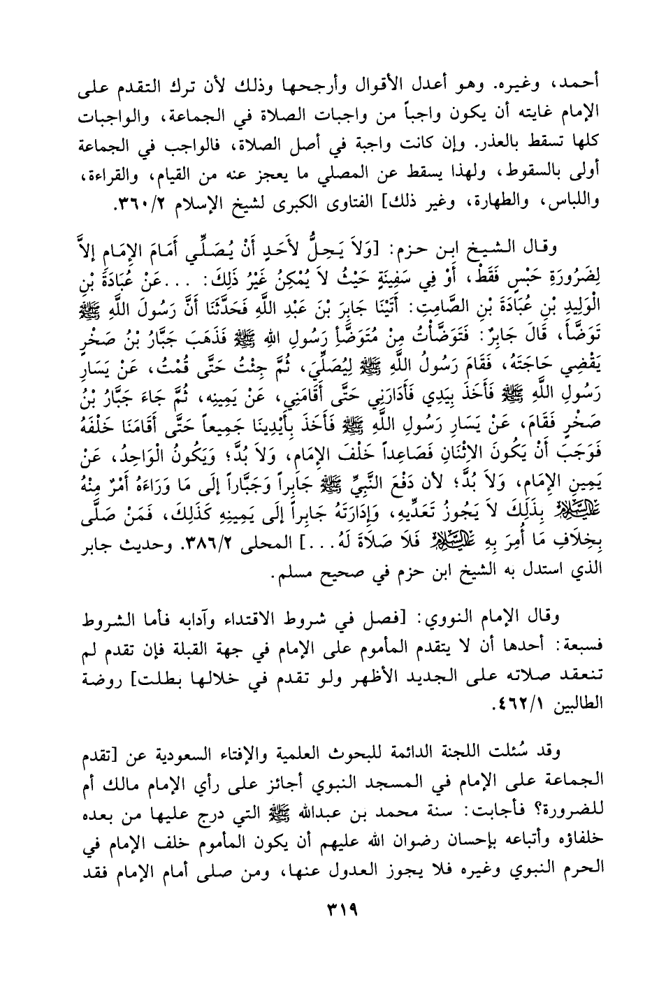 وقال الشيخ ابن حزم: [وَلاَ يَحِلُّ لأَحَدٍ أَنْ يُصَلِّي أَمَامَ الإِمَامِ إلاَّ لِضَرُورَةِ حَبْسٍ فَقَطْ, أَوْ فِي سَفِينَةٍ حَيْثُ لاَ يُمْكِنُ غَيْرُ ذَلِكَ: ... عَنْ عُبَادَةَ بْنِ الْوَلِيدِ بْنِ عُبَادَةَ بْنِ الصَّامِتِ: أَتَيْنَا جَابِرَ بْنَ عَبْدِ اللَّهِ فَحَدَّثَنَا أَنَّ رَسُولَ اللَّهِ - صَلَّى اللهُ عَلَيْهِ وَسَلَّمَ - تَوَضَّأَ, قَالَ جَابِرٌ: فَتَوَضَّأْتُ مِنْ مُتَوَضَّأِ رَسُولِ اللَّهِ - صَلَّى اللهُ عَلَيْهِ وَسَلَّمَ - فَذَهَبَ جَبَّارُ بْنُ صَخْرٍ يَقْضِي حَاجَتَهُ, فَقَامَ رَسُولُ اللَّهِ - صَلَّى اللهُ عَلَيْهِ وَسَلَّمَ - لِيُصَلِّيَ, ثُمَّ جِئْتُ حَتَّى قُمْتُ، عَنْ يَسَارِ رَسُولِ اللَّهِ - صَلَّى اللهُ عَلَيْهِ وَسَلَّمَ - فَأَخَذَ بِيَدِي فَأَدَارَنِي حَتَّى أَقَامَنِي، عَنْ يَمِينِه, ثُمَّ جَاءَ جَبَّارُ بْنُ صَخْرٍ فَقَامَ، عَنْ يَسَارِ رَسُولِ اللَّهِ - صَلَّى اللهُ عَلَيْهِ وَسَلَّمَ - فَأَخَذَ بِأَيْدِينَا جَمِيعًا حَتَّى أَقَامَنَا خَلْفَهُ فَوَجَبَ أَنْ يَكُونَ الاِثْنَانِ فَصَاعِدًا خَلْفَ الإِمَامِ، وَلاَ بُدَّ; وَيَكُونُ الْوَاحِدُ، عَنْ يَمِينِ الإِمَامِ، وَلاَ بُدَّ؛ لأن دَفْعَ النَّبِيِّ - صَلَّى اللهُ عَلَيْهِ وَسَلَّمَ - جَابِرًا وَجَبَّارًا إلَى مَا وَرَاءَهُ أَمْرٌ مِنْهُ عليه السلام بِذَلِكَ لاَ يَجُوزُ تَعَدِّيهِ, وَإِدَارَتَهُ جَابِرًا إلَى يَمِينِهِ كَذَلِكَ; فَمَنْ صَلَّى بِخِلاَفِ مَا أُمِرَ بِهِ عليه السلام فَلاَ صَلاَةَ لَهُ ... ] المحلى 2/ 386. وحديث جابر الذي استدل به الشيخ ابن حزم في صحيح مسلم.