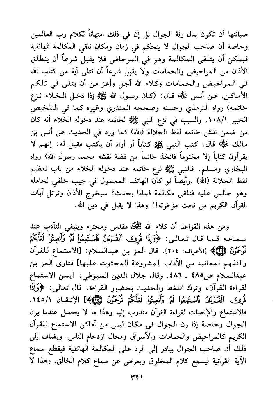 صيانتها أن تكون بدل رنة الجوال بل إن في ذلك امتهاناً لكلام رب العالمين وخاصة أن صاحب الجوال لا يتحكم في زمان ومكان تلقي المكالمة الهاتفية فيمكن أن يتلقى المكالمة وهو في المرحاض فلا يقبل شرعاً أن ينطلق الأذان من المراحيض والحمامات ولا يقبل شرعاً أن تتلى آية من كتاب الله في المراحيض والحمامات وكلام الله أجل وأعز من أن يتلى في تلكم الأماكن. عن أنس - رضي الله عنه - قال: (كان رسول الله - صَلَّى اللهُ عَلَيْهِ وَسَلَّمَ - إذا دخل الخلاء نزع خاتمه) رواه الترمذي وحسنه وصححه المنذري وغيره كما في التلخيص الحبير 1/ 108. والسبب في نزع النبي - صَلَّى اللهُ عَلَيْهِ وَسَلَّمَ - لخاتمه عند دخوله الخلاء أنه كان من ضمن نقش خاتمه لفظ الجلالة (الله) كما ورد في الحديث عن أنس بن مالك - رضي الله عنه - قال كتب النبي - صَلَّى اللهُ عَلَيْهِ وَسَلَّمَ - كتاباً أو أراد أن يكتب فقيل له إنهم لا يقرأون كتاباً إلا مختوماً فاتخذ خاتماً من فضة نقشه محمد رسول الله) رواه البخاري ومسلم. فالنبي - صَلَّى اللهُ عَلَيْهِ وَسَلَّمَ - نزع خاتمه عند دخوله الخلاء من باب تعظيم لفظ الجلالة (الله). وأيضاً لو كان الهاتف المحمول في جيب خلفي لحامله وهو جالس عليه فتلقى مكالمة فماذا يحدث؟ سيخرج الأذان وترتل آيات القرآن الكريم من تحت مؤخرته!! وهذا لا يقبل في دين الله.