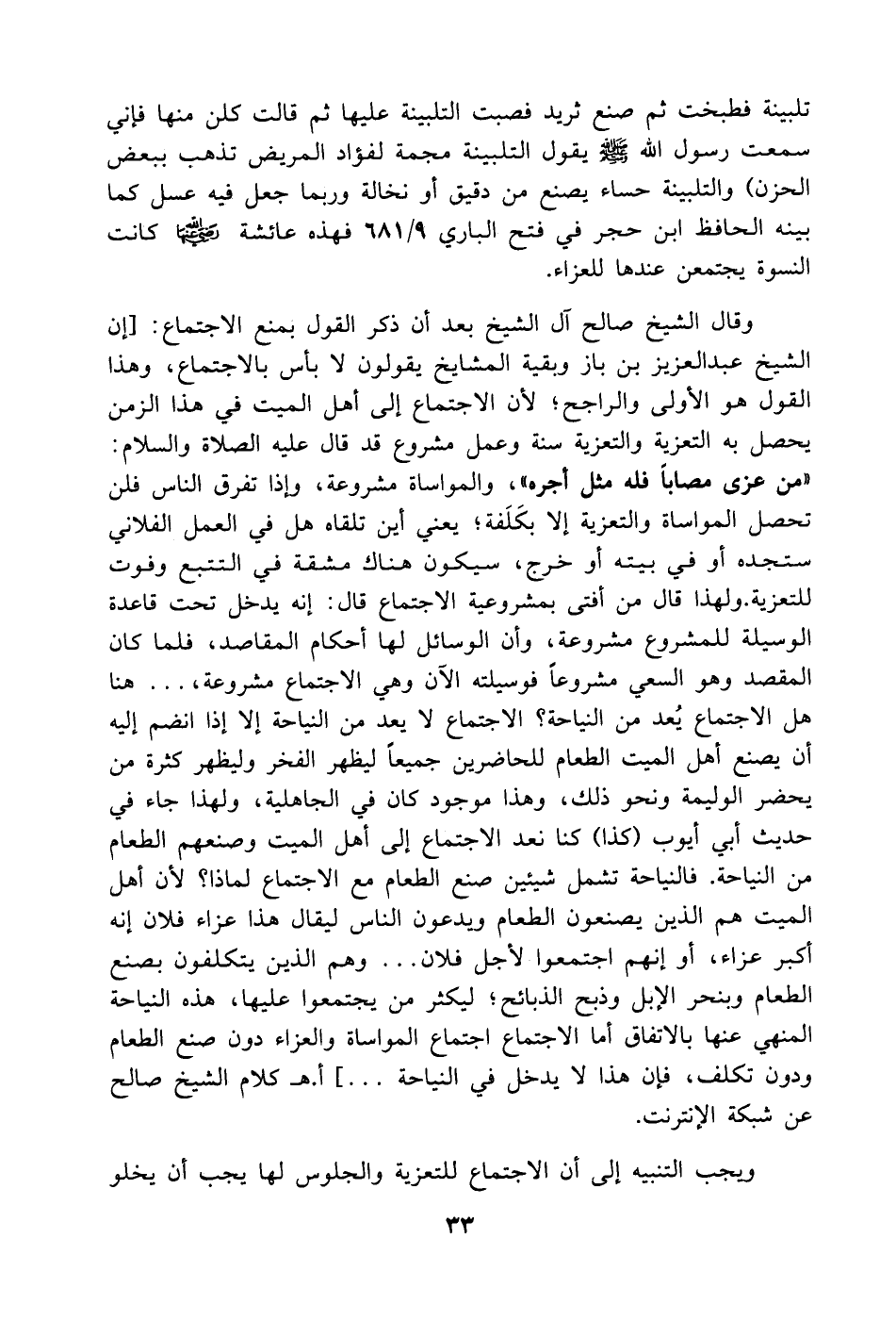 تلبينة فطبخت ثم صنع ثريد فصبت التلبينة عليها ثم قالت كلن منها فإني سمعت رسول الله - صَلَّى اللهُ عَلَيْهِ وَسَلَّمَ - يقول التلبينة مجمة لفؤاد المريض تذهب ببعض الحزن) والتلبينة حساء يصنع من دقيق أو نخالة وربما جعل فيه عسل كما بينه الحافظ ابن حجر في فتح الباري 9/ 681 فهذه عائشة رضي الله عنها كانت النسوة يجتمعن عندها للعزاء.