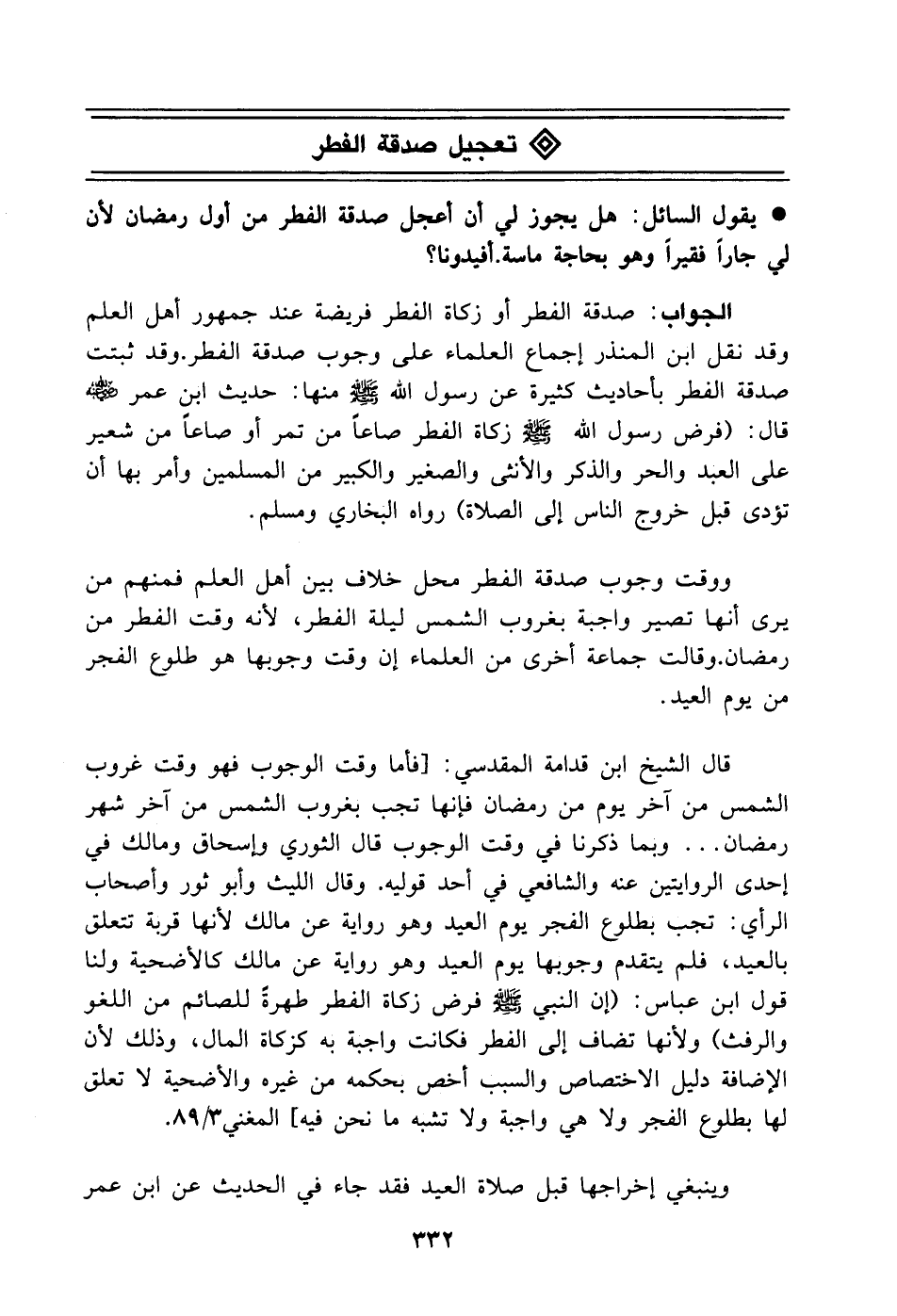يقول السائل: هل يجوز لي أن أعجل صدقة الفطر من أول رمضان لأن لي جاراً فقيراً وهو بحاجة ماسة. أفيدونا؟