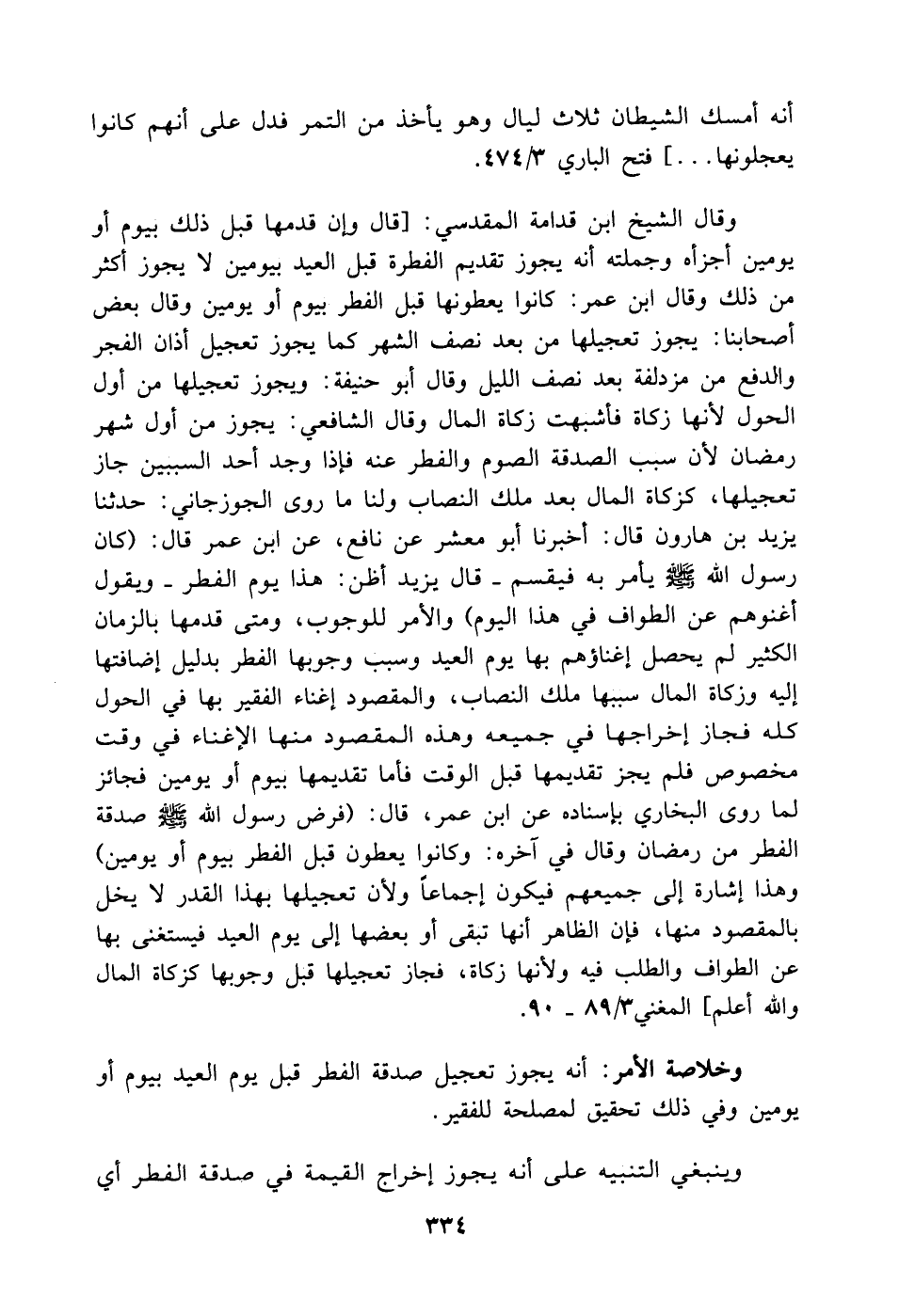وقال الشيخ ابن قدامة المقدسي: [قال وإن قدمها قبل ذلك بيوم أو يومين أجزأه وجملته أنه يجوز تقديم الفطرة قبل العيد بيومين لا يجوز أكثر من ذلك وقال ابن عمر: كانوا يعطونها قبل الفطر بيوم أو يومين وقال بعض أصحابنا: يجوز تعجيلها من بعد نصف الشهر كما يجوز تعجيل أذان الفجر والدفع من مزدلفة بعد نصف الليل وقال أبو حنيفة: ويجوز تعجيلها من أول الحول لأنها زكاة فأشبهت زكاة المال وقال الشافعي: يجوز من أول شهر رمضان لأن سبب الصدقة الصوم والفطر عنه فإذا وجد أحد السببين جاز تعجيلها، كزكاة المال بعد ملك النصاب ولنا ما روى الجوزجاني: حدثنا يزيد بن هارون قال: أخبرنا أبو معشر عن نافع، عن ابن عمر قال: (كان رسول الله - صَلَّى اللهُ عَلَيْهِ وَسَلَّمَ - يأمر به فيقسم - قال يزيد أظن: هذا يوم الفطر - ويقول أغنوهم عن الطواف في هذا اليوم) والأمر للوجوب, ومتى قدمها بالزمان الكثير لم يحصل إغناؤهم بها يوم العيد وسبب وجوبها الفطر بدليل إضافتها إليه وزكاة المال سببها ملك النصاب, والمقصود إغناء الفقير بها في الحول كله فجاز إخراجها في جميعه وهذه المقصود منها الإغناء في وقت مخصوص فلم يجز تقديمها قبل الوقت فأما تقديمها بيوم أو يومين فجائز لما روى البخاري بإسناده عن ابن عمر, قال: (فرض رسول الله - صَلَّى اللهُ عَلَيْهِ وَسَلَّمَ - صدقة الفطر من رمضان وقال في آخره: وكانوا يعطون قبل الفطر بيوم أو يومين) وهذا إشارة إلى جميعهم فيكون إجماعاً ولأن تعجيلها بهذا القدر لا يخل بالمقصود منها, فإن الظاهر أنها تبقى أو بعضها إلى يوم العيد فيستغنى بها عن الطواف والطلب فيه ولأنها زكاة, فجاز تعجيلها قبل وجوبها كزكاة المال والله أعلم] المغني3/ 89 - 90.