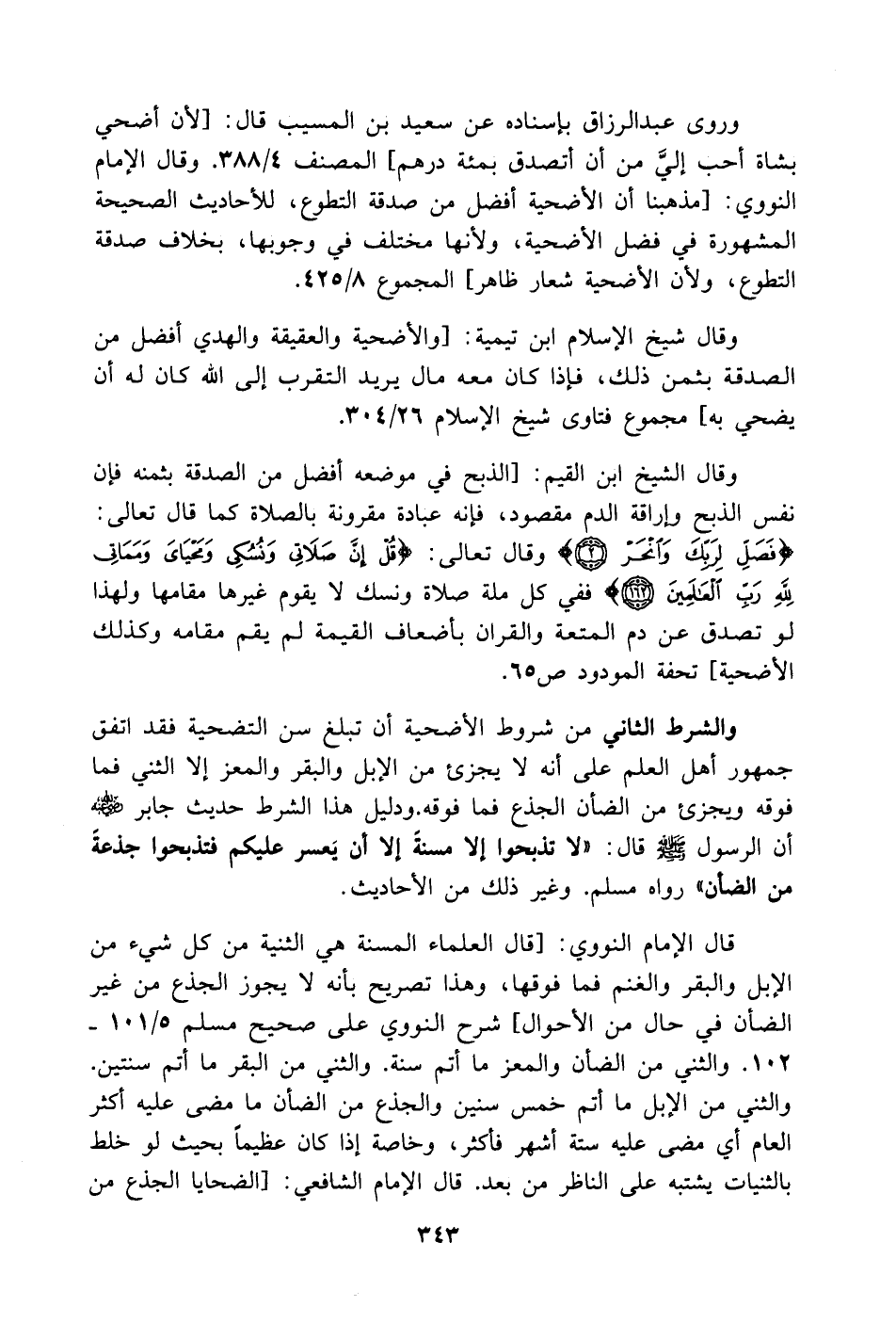 قال الإمام النووي: [قال العلماء المسنة هي الثنية من كل شيء من الإبل والبقر والغنم فما فوقها، وهذا تصريح بأنه لا يجوز الجذع من غير الضأن في حال من الأحوال] شرح النووي على صحيح مسلم 5/ 101 - 102. والثني من الضأن والمعز ما أتم سنة. والثني من البقر ما أتم سنتين. والثني من الإبل ما أتم خمس سنين والجذع من الضأن ما مضى عليه أكثر العام أي مضى عليه ستة أشهر فأكثر، وخاصة إذا كان عظيماً بحيث لو خلط بالثنيات يشتبه على الناظر من بعد. قال الإمام الشافعي: [الضحايا الجذع من