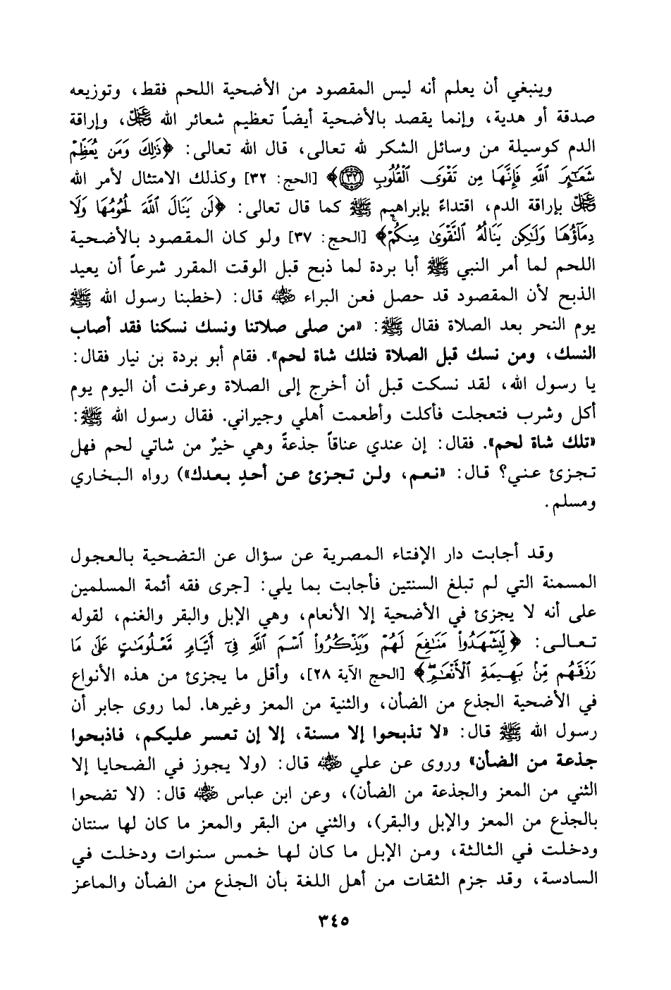وقد أجابت دار الإفتاء المصرية عن سؤال عن التضحية بالعجول المسمنة التي لم تبلغ السنتين فأجابت بما يلي: [جرى فقه أئمة المسلمين على أنه لا يجزئ في الأضحية إلا الأنعام، وهى الإبل والبقر والغنم، لقوله تعالى: {لِيَشْهَدُوا مَنَافِعَ لَهُمْ وَيَذْكُرُوا اسْمَ اللَّهِ فِي أَيَّامٍ مَعْلُومَاتٍ عَلَى مَا رَزَقَهُمْ مِنْ بَهِيمَةِ الْأَنْعَامِ} سورة الحج الآية 28، وأقل ما يجزئ من هذه الأنواع في الأضحية الجذع من الضأن، والثنية من المعز وغيرها. لما روى جابر أن رسول الله - صَلَّى اللهُ عَلَيْهِ وَسَلَّمَ - قال: (لا تذبحوا إلا مسنة، إلا إن تعسر عليكم، فاذبحوا جذعة من الضأن) وروى عن علي - رضي الله عنه - قال: (ولا يجوز في الضحايا إلا الثني من المعز والجذعة من الضأن) وعن ابن عباس - رضي الله عنه - قال: (لا تضحوا بالجذع من المعز والإبل والبقر) والثني من البقر والمعز ما كان لها سنتان ودخلت في الثالثة، ومن الإبل ما كان لها خمس سنوات ودخلت في السادسة، وقد جزم الثقات من أهل اللغة بأن الجذع من الضأن والماعز