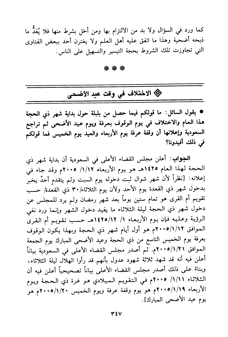 الجواب: أعلن مجلس القضاء الأعلى في السعودية أن بداية شهر ذي الحجة لهذا العام 1425هـ هو يوم الأربعاء 12/ 1/ 2005م وقد جاء في إعلانه: [نظراً لأن شهر شوال ثبت دخوله يوم السبت ولم يتقدم أحدٌ يخبر بدخول شهر ذي القعدة يوم الأحد ولأن يوم الثلاثاء/30 ذي القعدة/ حسب تقويم أم القرى هو تمام ستين يوماً بعد شهر رمضان ولم يرد للمجلس عن دخول شهر ذي الحجة ليلة الثلاثاء ما يفيد دخول الشهر وإنما ورد نفي الرؤية وعليه فإن يوم الأربعاء 1/ 12/1425هـ حسب تقويم أم القرى الموافق 12/ 1/2005م هو أول أيام شهر ذي الحجة وبهذا يكون الوقوف بعرفة يوم الخميس التاسع من ذي الحجة وعيد الأضحى المبارك يوم الجمعة الموافق 21/ 1/2005م]. ثم أصدر مجلس القضاء الأعلى في السعودية بياناً أعلن فيه أنه قد شهد ثلاثة شهود عدول بأنهم قد رأوا الهلال ليلة الثلاثاء، وبناءً على ذلك أصدر مجلس القضاء الأعلى بياناً تصحيحياً أعلن فيه أن الثلاثاء 11/ 1/ 2005 في التقويم الميلادي هو غرة ذي الحجة ويوم الأربعاء 19/ 1/2005 هو يوم وقفة عرفة ويوم الخميس 20/ 1/2005 هو يوم عيد الأضحى المبارك].
