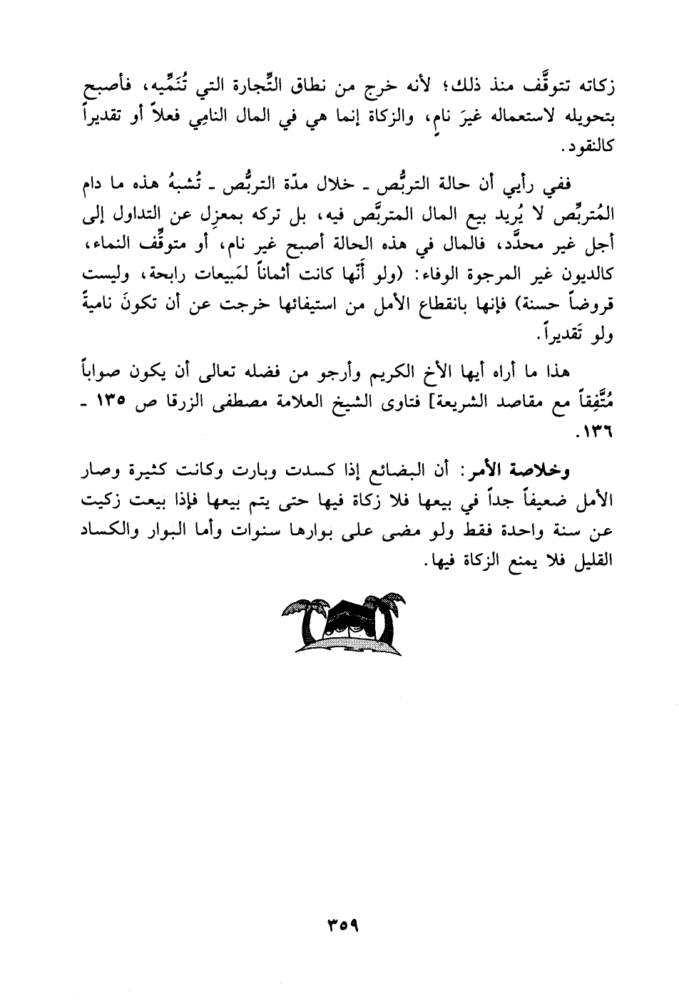ففي رأيي أن حالة التربُّص - خلال مدّة التربُّص- تُشبهُ هذه ما دام المُتربِّص لا يُريد بيع المال المتربَّص فيه، بل تركه بمعزِل عن التداول إلى أجل غير محدَّد، فالمال في هذه الحالة أصبح غير نام، أو متوقِّف النماء، كالديون غير المرجوة الوفاء (ولو أَنّها كانت أثمانًا لمَبيعات رابحة، وليست قروضًا حسنة) فإنها بانقطاع الأمل من استيفائها خرجت عن أن تكونَ ناميةً ولو تَقديراً.