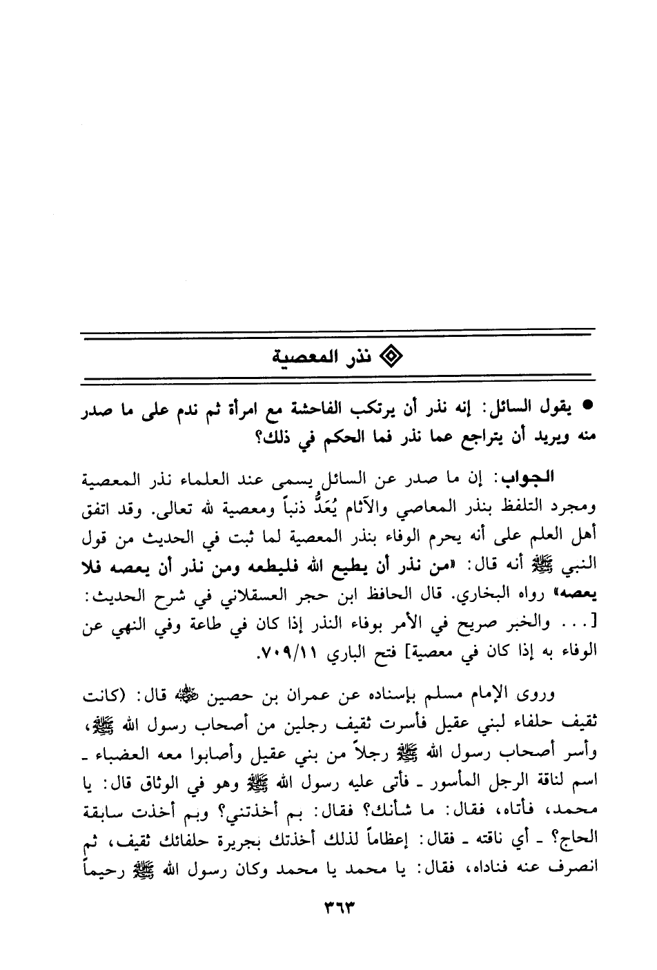 الجواب: إن ما صدر عن السائل يسمى عند العلماء نذر المعصية ومجرد التلفظ بنذر المعاصي والآثام يُعَدُّ ذنباً ومعصية لله تعالى. وقد اتفق أهل العلم على أنه يحرم الوفاء بنذر المعصية لما ثبت في الحديث من قول النبي - صَلَّى اللهُ عَلَيْهِ وَسَلَّمَ - أنه قال: (من نذر أن يطيع الله فليطعه ومن نذر أن يعصه فلا يعصه) رواه البخاري. قال الحافظ ابن حجر العسقلاني في شرح الحديث: [ ... والخبر صريح في الأمر بوفاء النذر إذا كان في طاعة وفي النهي عن الوفاء به إذا كان في معصية] فتح الباري 11/ 709.