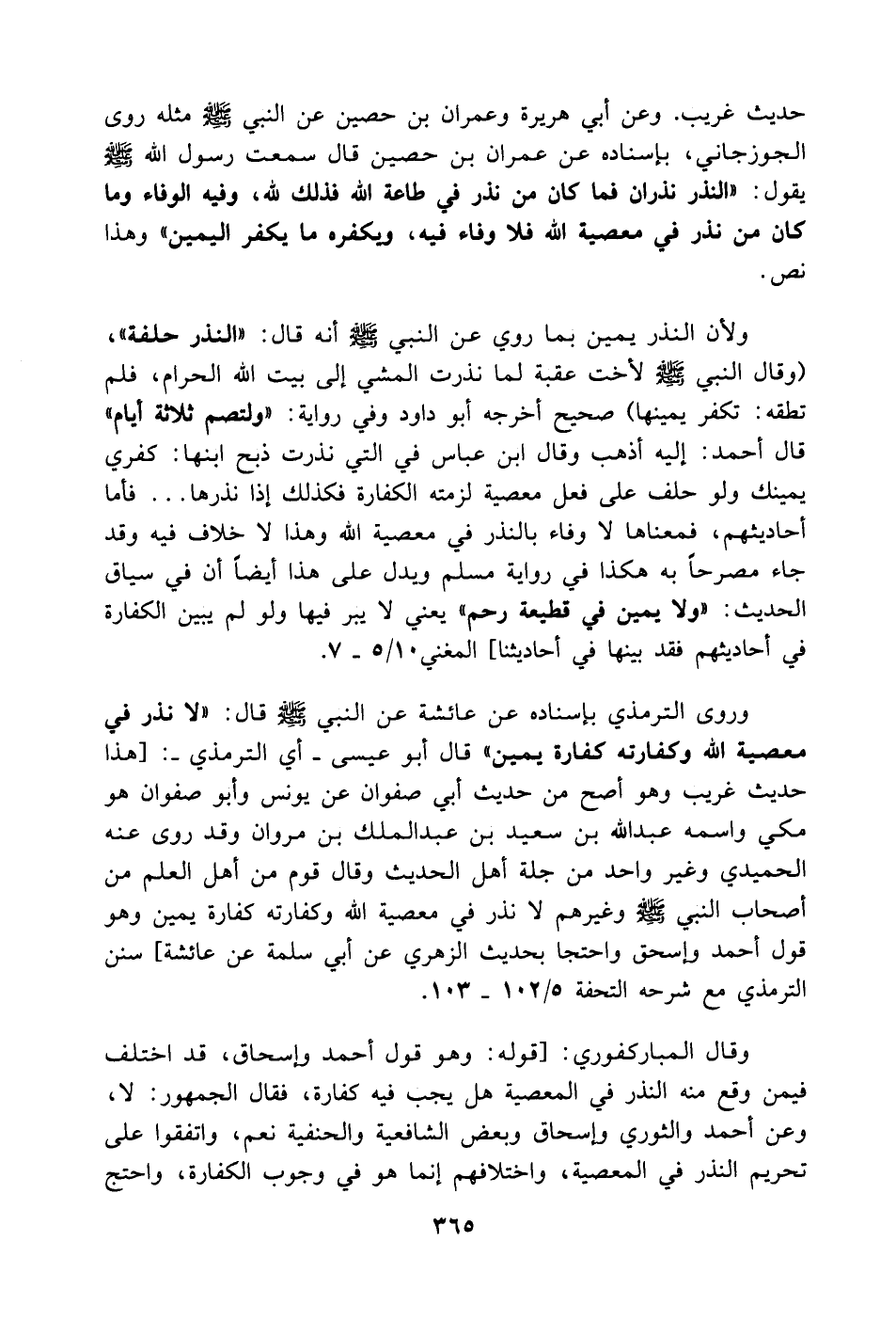 وقال المباركفوري: [قوله: وهو قول أحمد وإسحاق، قد اختلف فيمن وقع منه النذر في المعصية هل يجب فيه كفارة, فقال الجمهور: لا, وعن أحمد والثوري وإسحاق وبعض الشافعية والحنفية نعم, واتفقوا على تحريم النذر في المعصية, واختلافهم إنما هو في وجوب الكفارة, واحتج