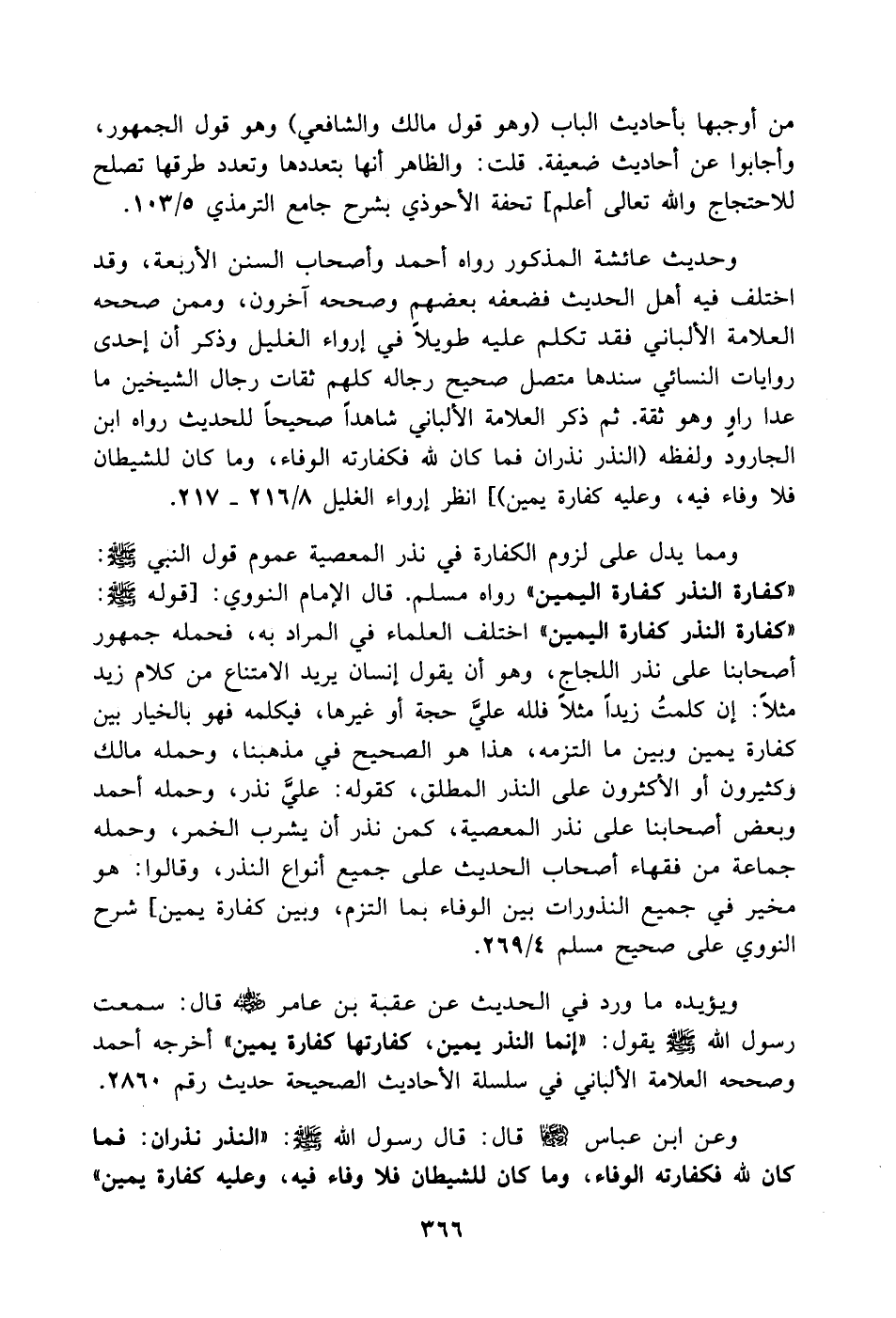 ومما يدل على لزوم الكفارة في نذر المعصية عموم قول النبي - صَلَّى اللهُ عَلَيْهِ وَسَلَّمَ -: (كفارة النذر كفارة اليمين) رواه مسلم. قال الإمام النووي: [قوله - صَلَّى اللهُ عَلَيْهِ وَسَلَّمَ -: (كفارة النذر كفارة اليمين) اختلف العلماء في المراد به, فحمله جمهور أصحابنا على نذر اللجاج, وهو أن يقول إنسان يريد الامتناع من كلام زيد مثلاً: إن كلمتُ زيداً مثلاً فلله عليَّ حجة أو غيرها, فيكلمه فهو بالخيار بين كفارة يمين وبين ما التزمه, هذا هو الصحيح في مذهبنا, وحمله مالك وكثيرون أو الأكثرون على النذر المطلق, كقوله: عليَّ نذر, وحمله أحمد وبعض أصحابنا على نذر المعصية, كمن نذر أن يشرب الخمر, وحمله جماعة من فقهاء أصحاب الحديث على جميع أنواع النذر, وقالوا: هو مخير في جميع النذورات بين الوفاء بما التزم, وبين كفارة يمين] شرح النووي على صحيح مسلم 4/ 269.