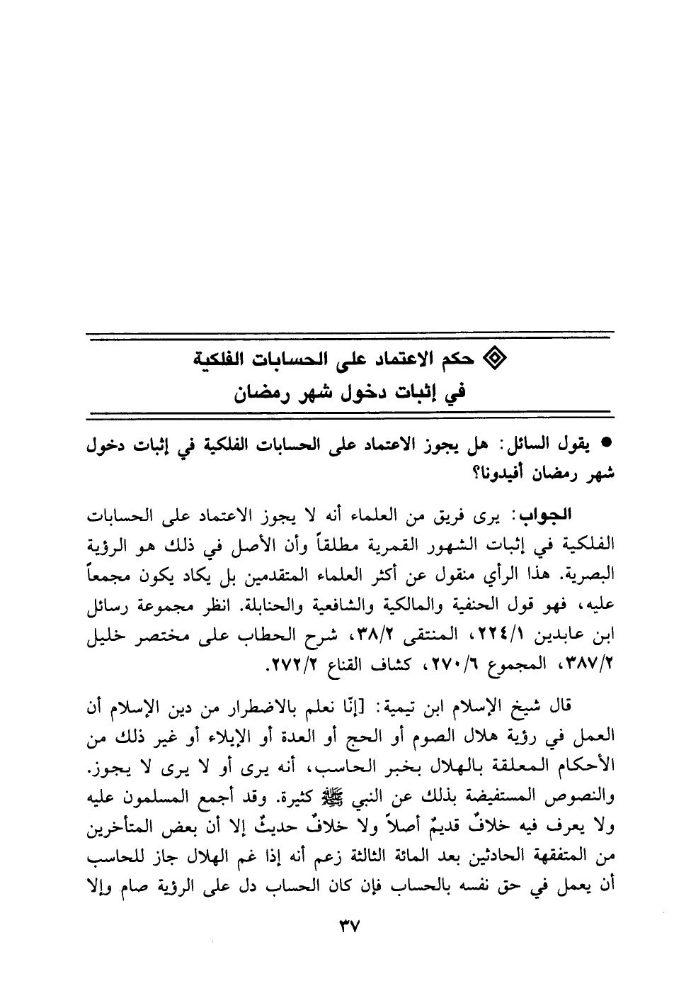 الجواب: يرى فريق من العلماء أنه لا يجوز الاعتماد على الحسابات الفلكية في إثبات الشهور القمرية مطلقاً وأن الأصل في ذلك هو الرؤية البصرية. هذا الرأي منقول عن أكثر العلماء المتقدمين بل يكاد يكون مجمعاً عليه، فهو قول الحنفية والمالكية والشافعية والحنابلة. انظر مجموعة رسائل ابن عابدين 1/ 224، المنتقى 2/ 38، شرح الحطاب على مختصر خليل 2/ 387، المجموع 6/ 270، كشاف القناع 2/ 272.