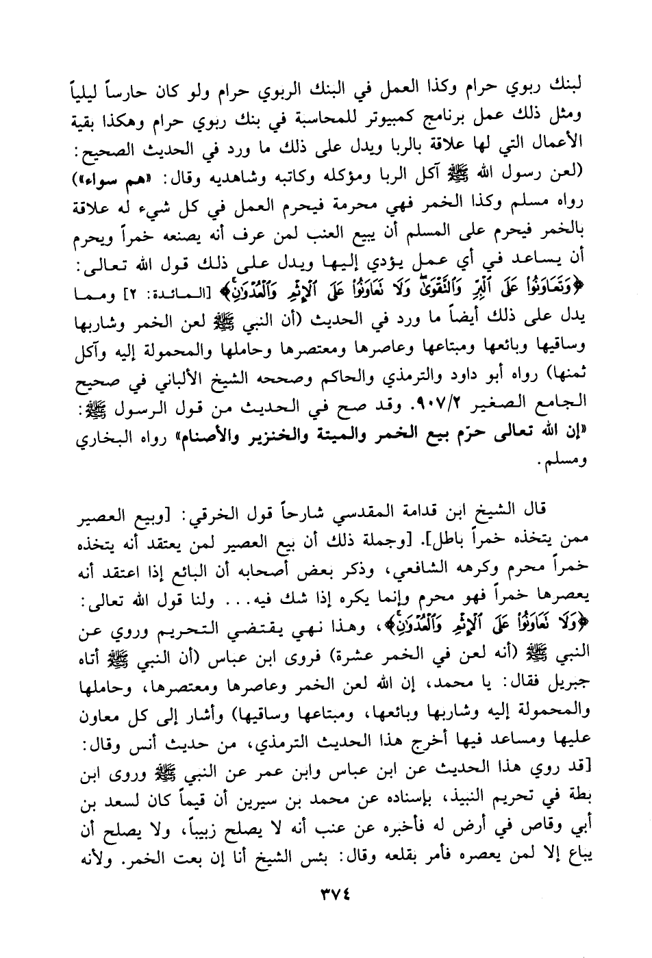 لبنك ربوي حرام وكذا العمل في البنك الربوي حرام ولو كان حارساً ليلياً ومثل ذلك عمل برنامج كمبيوتر للمحاسبة في بنك ربوي حرام وهكذا بقية الأعمال التي لها علاقة بالربا ويدل على ذلك ما ورد في الحديث الصحيح (لعن رسول الله - صَلَّى اللهُ عَلَيْهِ وَسَلَّمَ - آكل الربا ومؤكله وكاتبه وشاهديه وقال: هم سواء) رواه مسلم وكذا الخمر فهي محرمة فيحرم العمل في كل شيء له علاقة بالخمر فيحرم على المسلم أن يبيع العنب لمن عرف أنه يصنعه خمراً ويحرم أن يساعد في أي عمل يؤدي إليها ويدل على ذلك قول الله تعالى: {وَتَعَاوَنُوا عَلَى الْبِرِّ وَالتَّقْوَى وَلَا تَعَاوَنُوا عَلَى الْإِثْمِ وَالْعُدْوَانِ} سورة المائدة الآية 2. ومما يدل على ذلك أيضا ما ورد في الحديث (أن النبي- صَلَّى اللهُ عَلَيْهِ وَسَلَّمَ - لعن الخمر وشاربها وساقيها وبائعها ومبتاعها وعاصرها ومعتصرها وحاملها والمحمولة إليه وآكل ثمنها) رواه أبو داود والترمذي والحاكم وصححه الشيخ الألباني في صحيح الجامع الصغير 2/ 907. وقد صح في الحديث من قول الرسول - صَلَّى اللهُ عَلَيْهِ وَسَلَّمَ -: (إن الله تعالى حرّم بيع الخمر والميتة والخنزير والأصنام) رواه البخاري ومسلم.